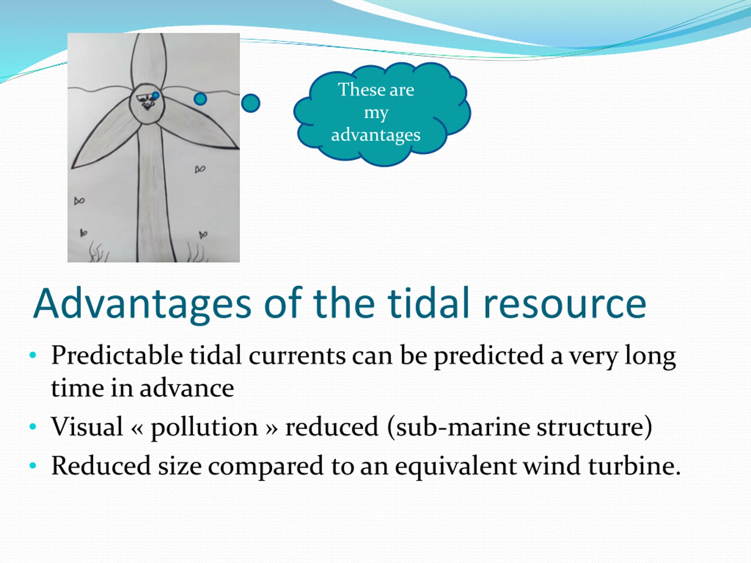 These are my advantages Advantages of the tidal resource Predictable tidal currents can be predicted a very long time in advance Visual pollution reduced (sub-marine structure) Reduced size compared to an equivalent wind turbine.