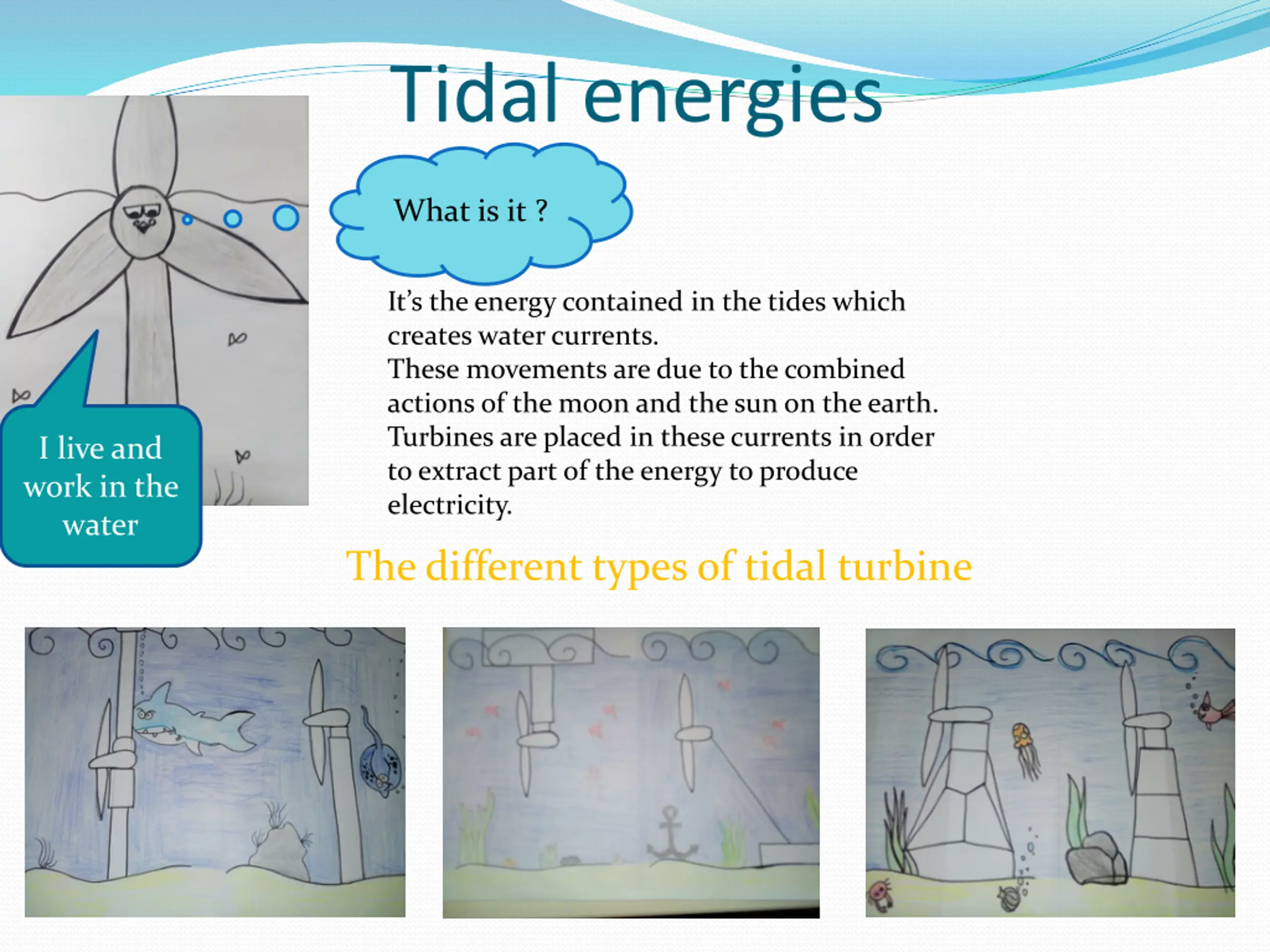 Tidal energies What is it ? It s the energy contained in the tides which creates water currents. These movements are due to the combined actions of the moon and the sun on the earth. Turbines are placed in these currents in order to extract part of the energy to produce electricity. I live and work in the water The different types of tidal turbine