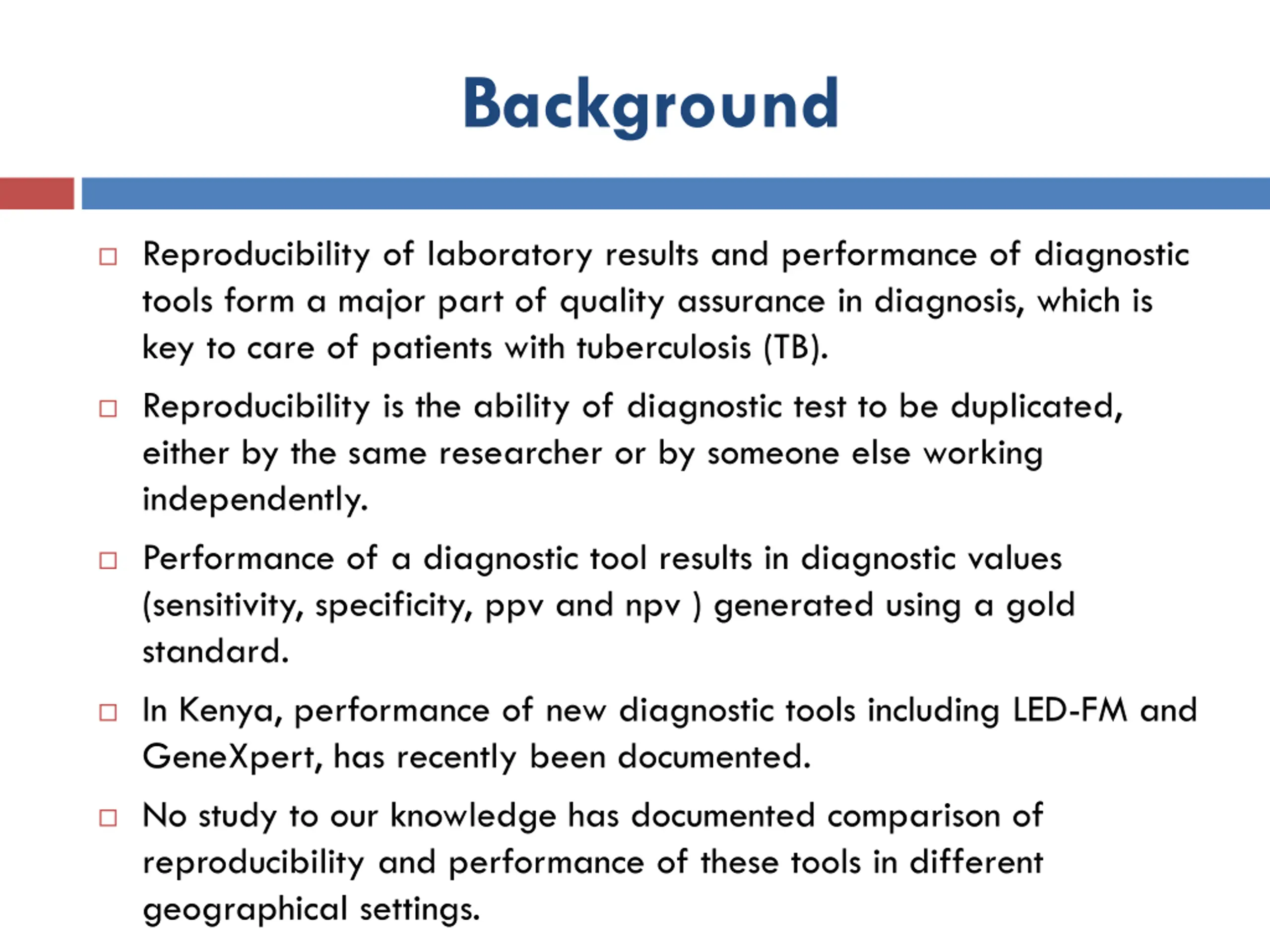 Background Reproducibility of laboratory results and performance of diagnostic tools form a major part of quality assurance in diagnosis, which is key to care of patients with tuberculosis (TB). Reproducibility is the ability of diagnostic test to be duplicated, either by the same researcher or by someone else working independently. Performance of a diagnostic tool results in diagnostic values (sensitivity, specificity, ppv and npv ) generated using a gold standard. In Kenya, performance of new diagnostic tools including LED-FM and GeneXpert, has recently been documented. No study to our knowledge has documented comparison of reproducibility and performance of these tools in different geographical settings.