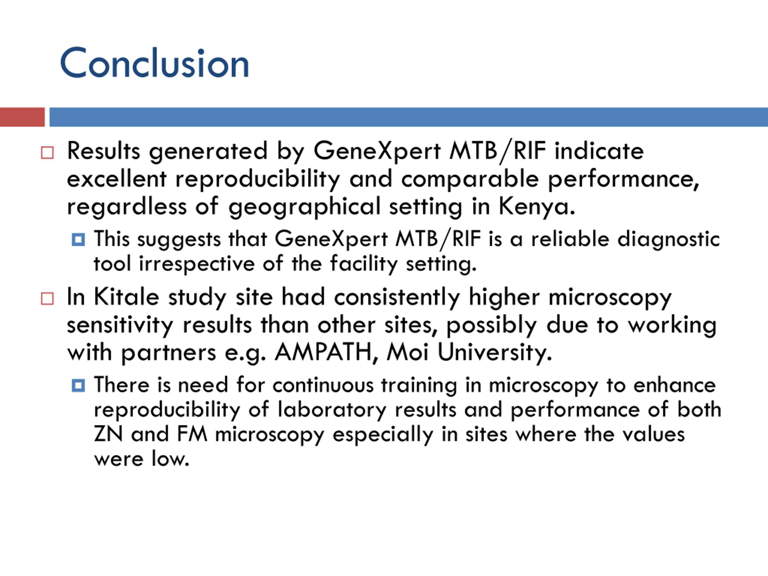 Conclusion Results generated by GeneXpert MTB/RIF indicate excellent reproducibility and comparable performance, regardless of geographical setting in Kenya. This suggests that GeneXpert MTB/RIF is a reliable diagnostic tool irrespective of the facility setting. In Kitale study site had consistently higher microscopy sensitivity results than other sites, possibly due to working with partners e.g. AMPATH, Moi University. There is need for continuous training in microscopy to enhance reproducibility of laboratory results and performance of both ZN and FM microscopy especially in sites where the values were low.