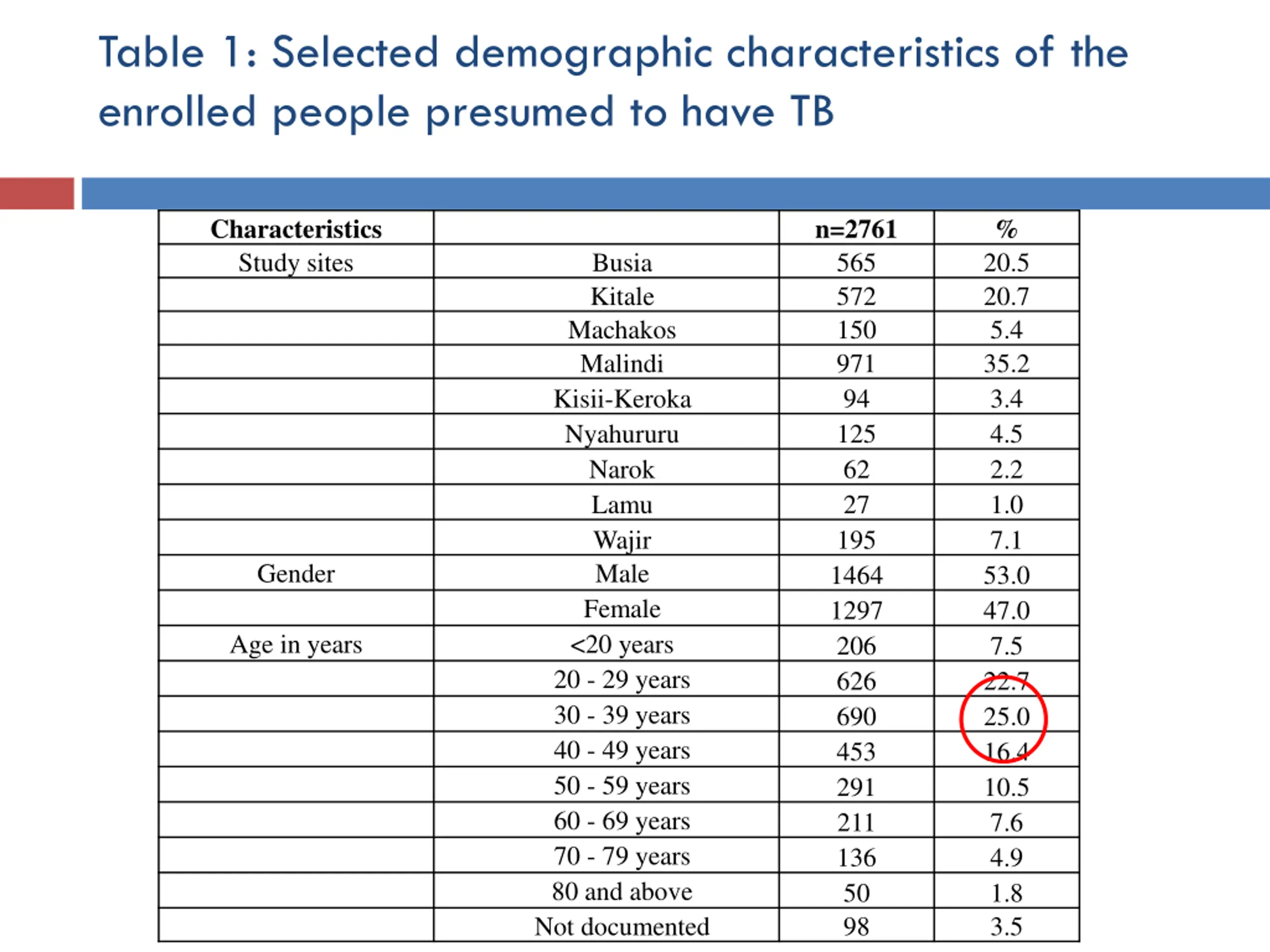 Table 1: Selected demographic characteristics of the enrolled people presumed to have TB Characteristics Study sites n=2761 565 572 150 971 94 125 62 27 195 1464 1297 206 626 690 453 291 211 136 50 98 % 20.5 20.7 5.4 35.2 3.4 4.5 2.2 1.0 7.1 53.0 47.0 7.5 22.7 25.0 16.4 10.5 7.6 4.9 1.8 3.5 Busia Kitale Machakos Malindi Kisii-Keroka Nyahururu Narok Lamu Wajir Male Female <20 years 20 - 29 years 30 - 39 years 40 - 49 years 50 - 59 years 60 - 69 years 70 - 79 years 80 and above Not documented Gender Age in years