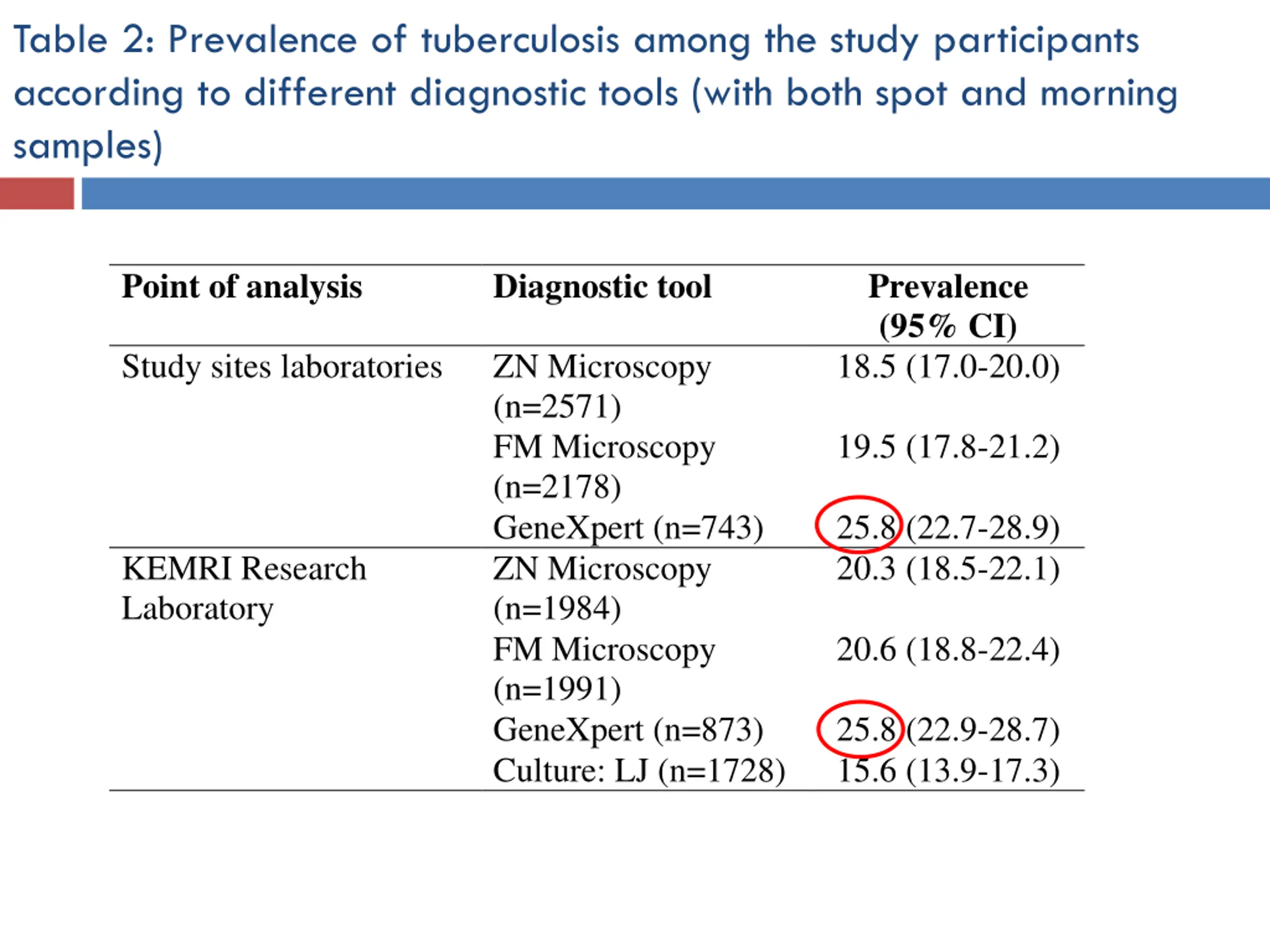 Table 2: Prevalence of tuberculosis among the study participants according to different diagnostic tools (with both spot and morning samples) Point of analysis Diagnostic tool Prevalence (95% CI) 18.5 (17.0-20.0) Study sites laboratories ZN Microscopy (n=2571) FM Microscopy (n=2178) GeneXpert (n=743) ZN Microscopy (n=1984) FM Microscopy (n=1991) GeneXpert (n=873) Culture: LJ (n=1728) 19.5 (17.8-21.2) 25.8 (22.7-28.9) 20.3 (18.5-22.1) KEMRI Research Laboratory 20.6 (18.8-22.4) 25.8 (22.9-28.7) 15.6 (13.9-17.3)
