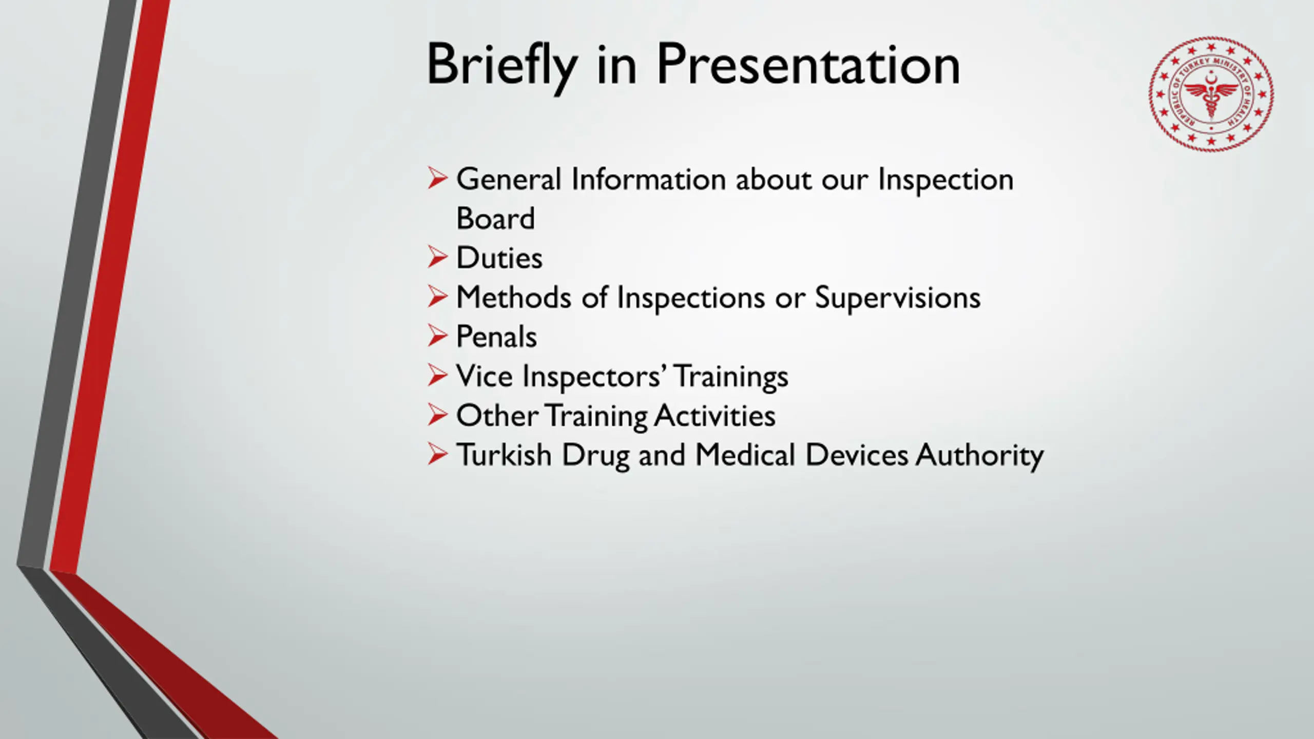 Briefly in Presentation General Information about our Inspection Board Duties Methods of Inspections or Supervisions Penals Vice Inspectors Trainings Other Training Activities Turkish Drug and Medical Devices Authority