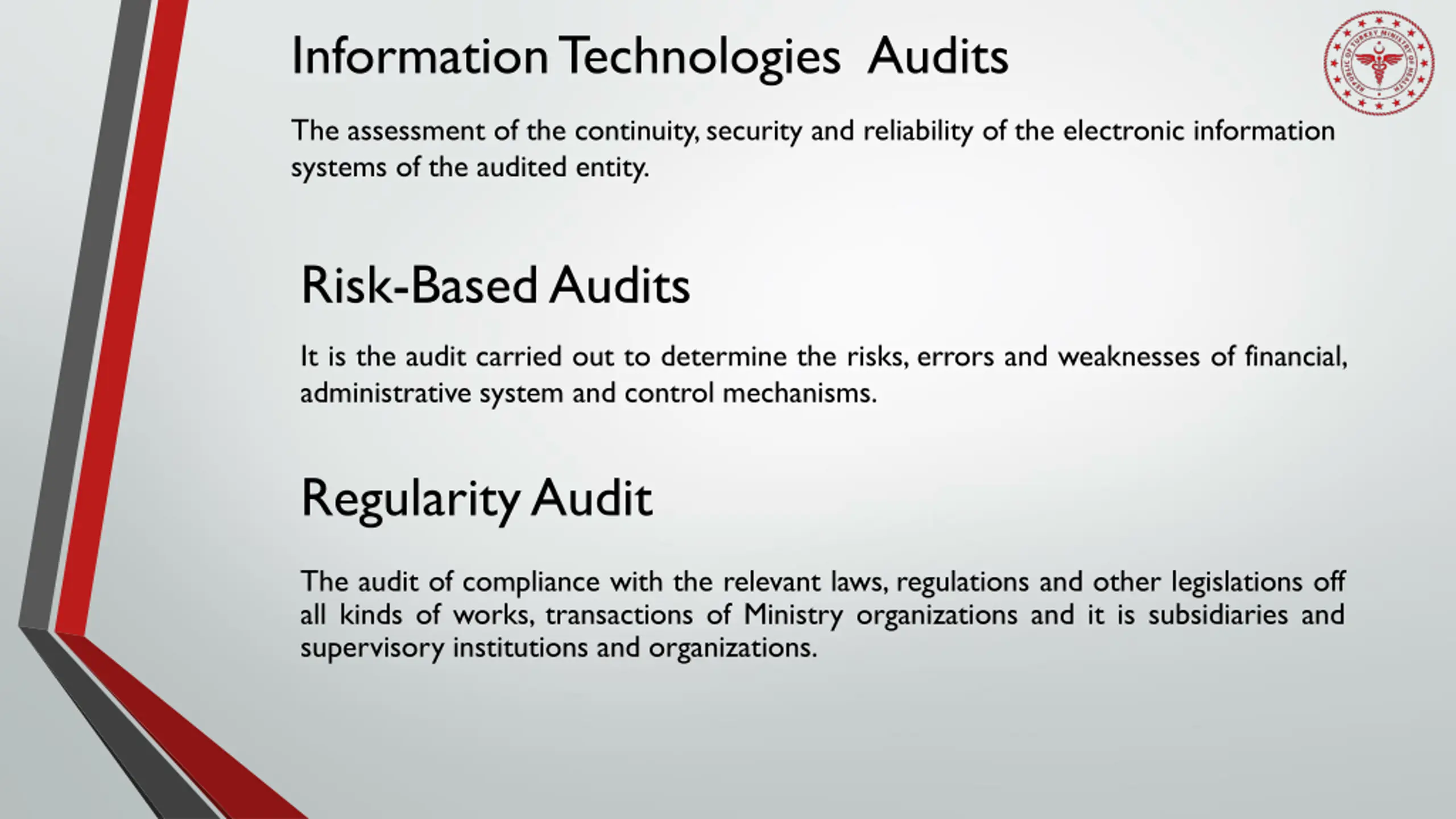 Information Technologies Audits The assessment of the continuity, security and reliability of the electronic information systems of the audited entity. Risk-Based Audits It is the audit carried out to determine the risks, errors and weaknesses of financial, administrative system and control mechanisms. Regularity Audit The audit of compliance with the relevant laws, regulations and other legislations off all kinds of works, transactions of Ministry organizations and it is subsidiaries and supervisory institutions and organizations.