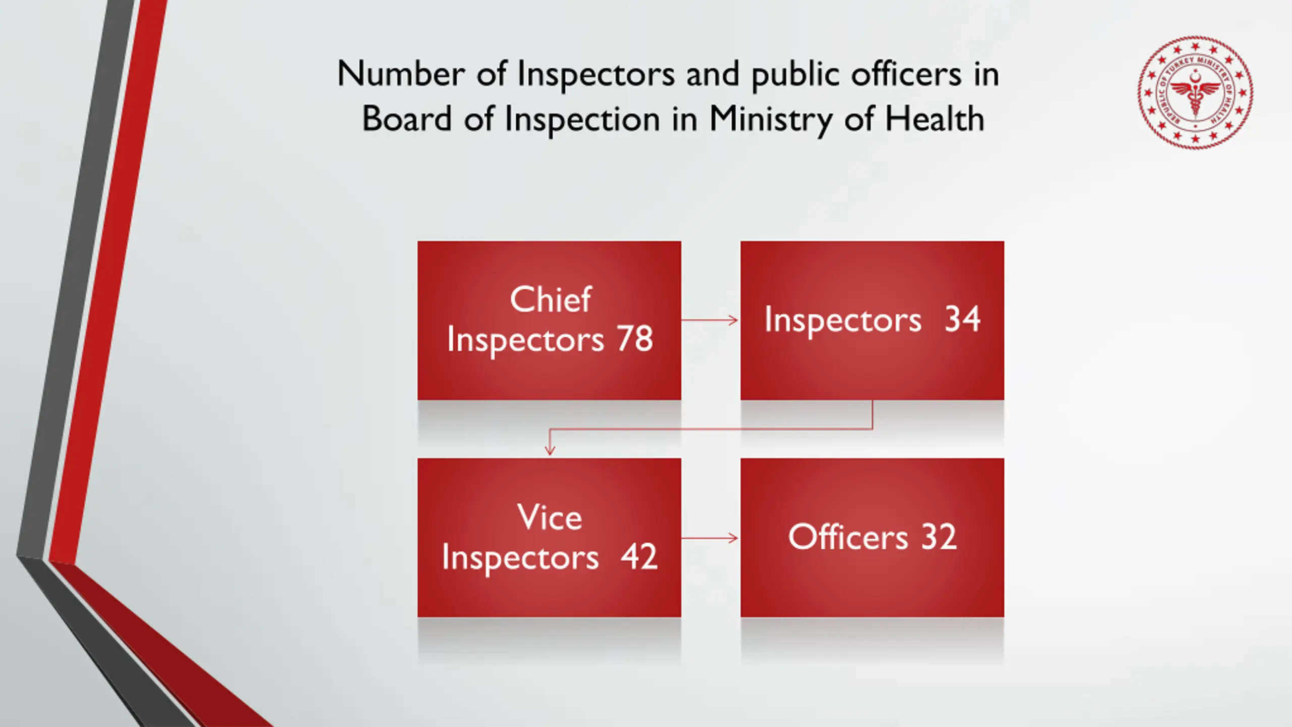 Number of Inspectors and public officers in Board of Inspection in Ministry of Health Chief Inspectors 34 Inspectors 78 Vice Officers 32 Inspectors 42