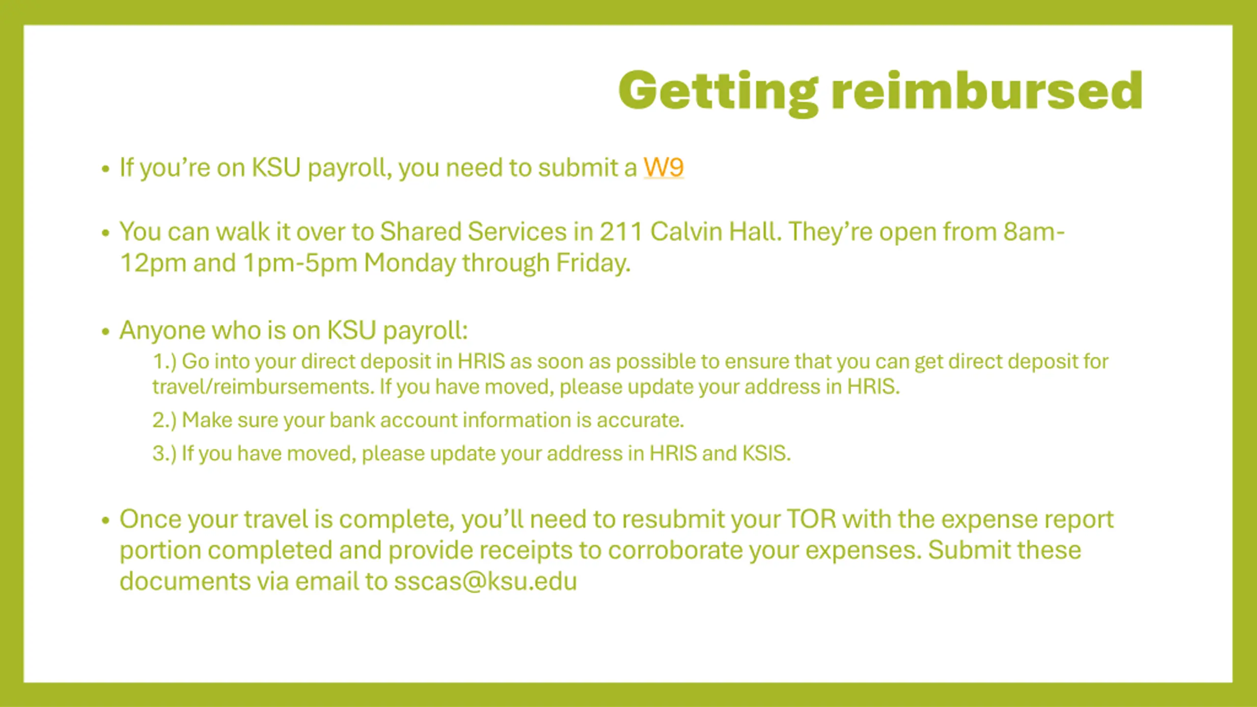 Getting reimbursed If you re on KSU payroll, you need to submit a W9 You can walk it over to Shared Services in 211 Calvin Hall. They re open from 8am- 12pm and 1pm-5pm Monday through Friday. Anyone who is on KSU payroll: 1.) Go into your direct deposit in HRIS as soon as possible to ensure that you can get direct deposit for travel/reimbursements. If you have moved, please update your address in HRIS. 2.) Make sure your bank account information is accurate. 3.) If you have moved, please update your address in HRIS and KSIS. Once your travel is complete, you ll need to resubmit your TOR with the expense report portion completed and provide receipts to corroborate your expenses. Submit these documents via email to sscas@ksu.edu