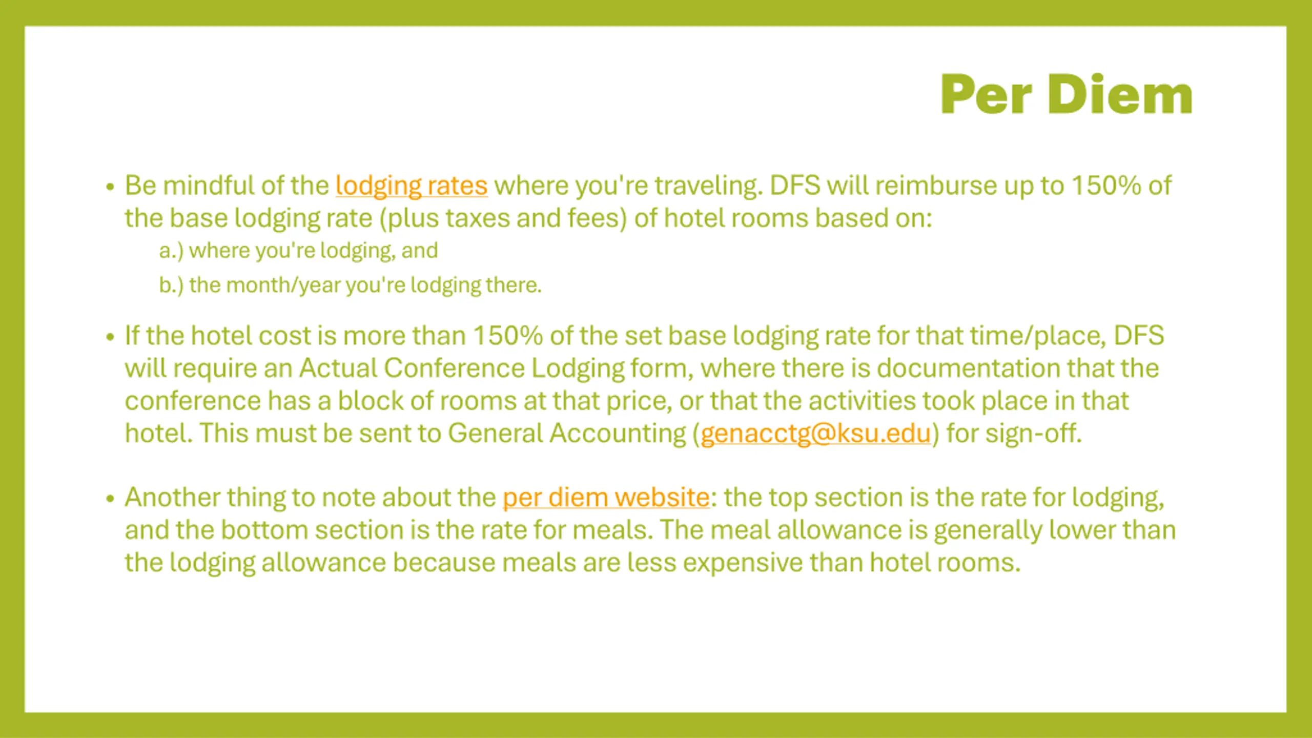 Per Diem Be mindful of the lodging rates where you're traveling. DFS will reimburse up to 150% of the base lodging rate (plus taxes and fees) of hotel rooms based on: a.) where you're lodging, and b.) the month/year you're lodging there. If the hotel cost is more than 150% of the set base lodging rate for that time/place, DFS will require an Actual Conference Lodging form, where there is documentation that the conference has a block of rooms at that price, or that the activities took place in that hotel. This must be sent to General Accounting (genacctg@ksu.edu) for sign-off. Another thing to note about the per diem website: the top section is the rate for lodging, and the bottom section is the rate for meals. The meal allowance is generally lower than the lodging allowance because meals are less expensive than hotel rooms.