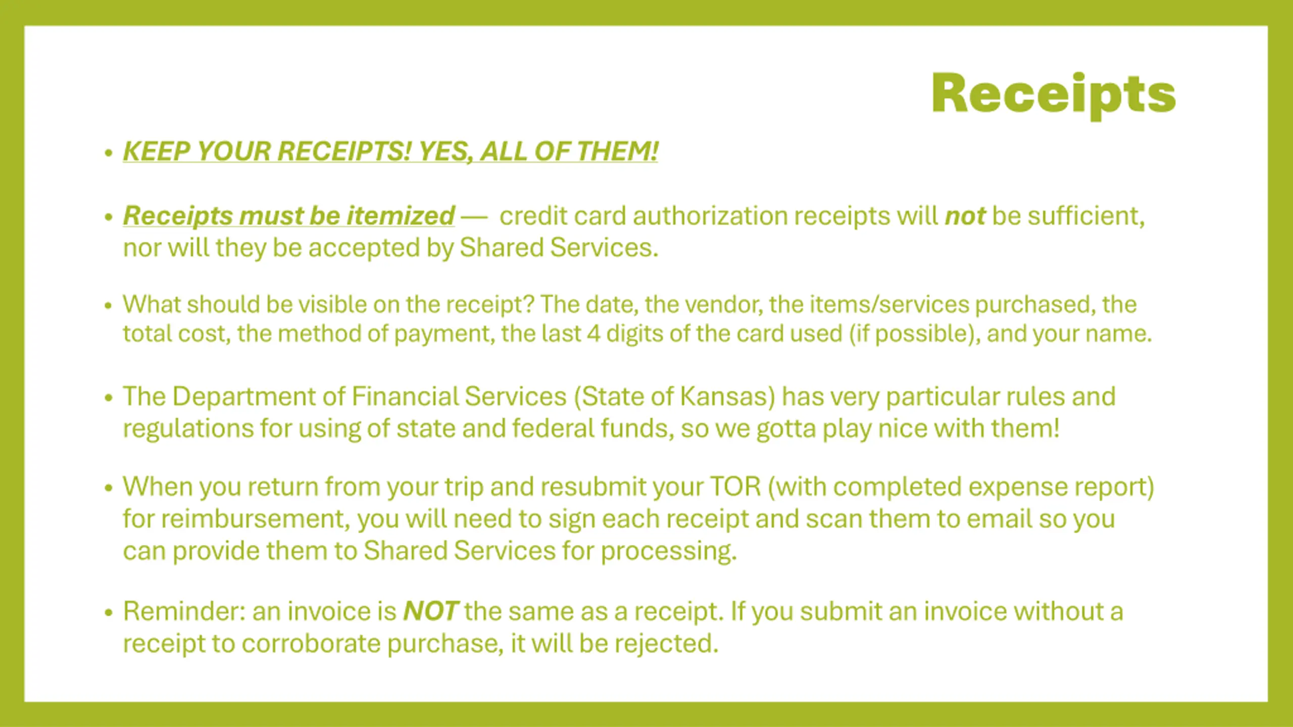 Receipts KEEP YOUR RECEIPTS! YES, ALL OF THEM! Receipts must be itemized credit card authorization receipts will not be sufficient, nor will they be accepted by Shared Services. What should be visible on the receipt? The date, the vendor, the items/services purchased, the total cost, the method of payment, the last 4 digits of the card used (if possible), and your name. The Department of Financial Services (State of Kansas) has very particular rules and regulations for using of state and federal funds, so we gotta play nice with them! When you return from your trip and resubmit your TOR (with completed expense report) for reimbursement, you will need to sign each receipt and scan them to email so you can provide them to Shared Services for processing. Reminder: an invoice is NOT the same as a receipt. If you submit an invoice without a receipt to corroborate purchase, it will be rejected.
