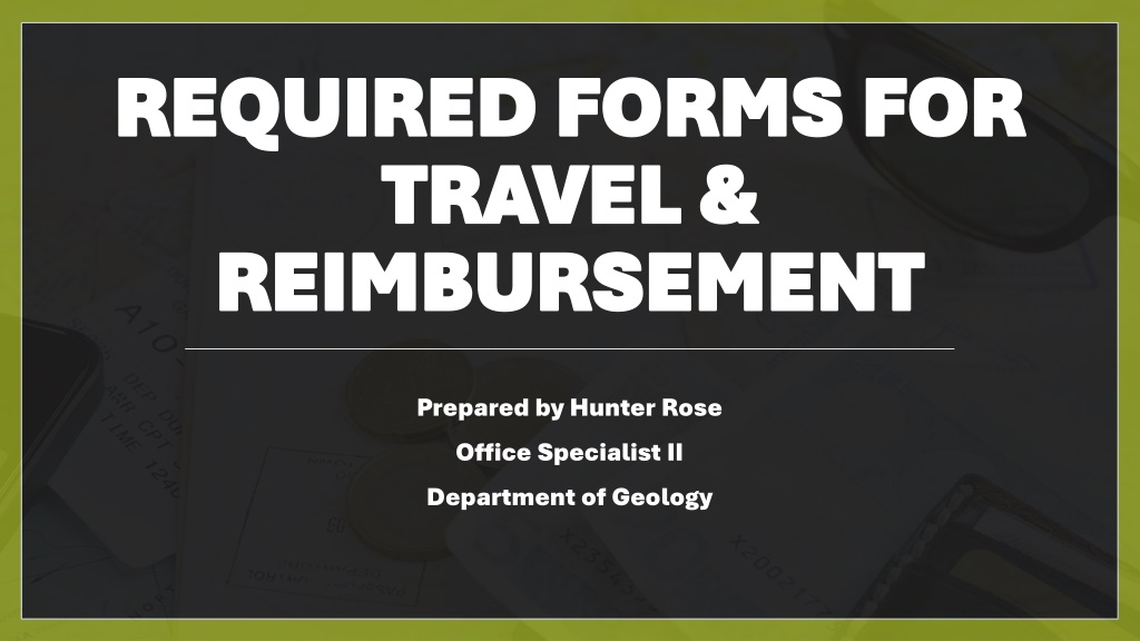 REQUIRED FORMS FOR REQUIRED FORMS FOR TRAVEL & TRAVEL & REIMBURSEMENT REIMBURSEMENT Prepared by Hunter Rose Office Specialist II Department of Geology