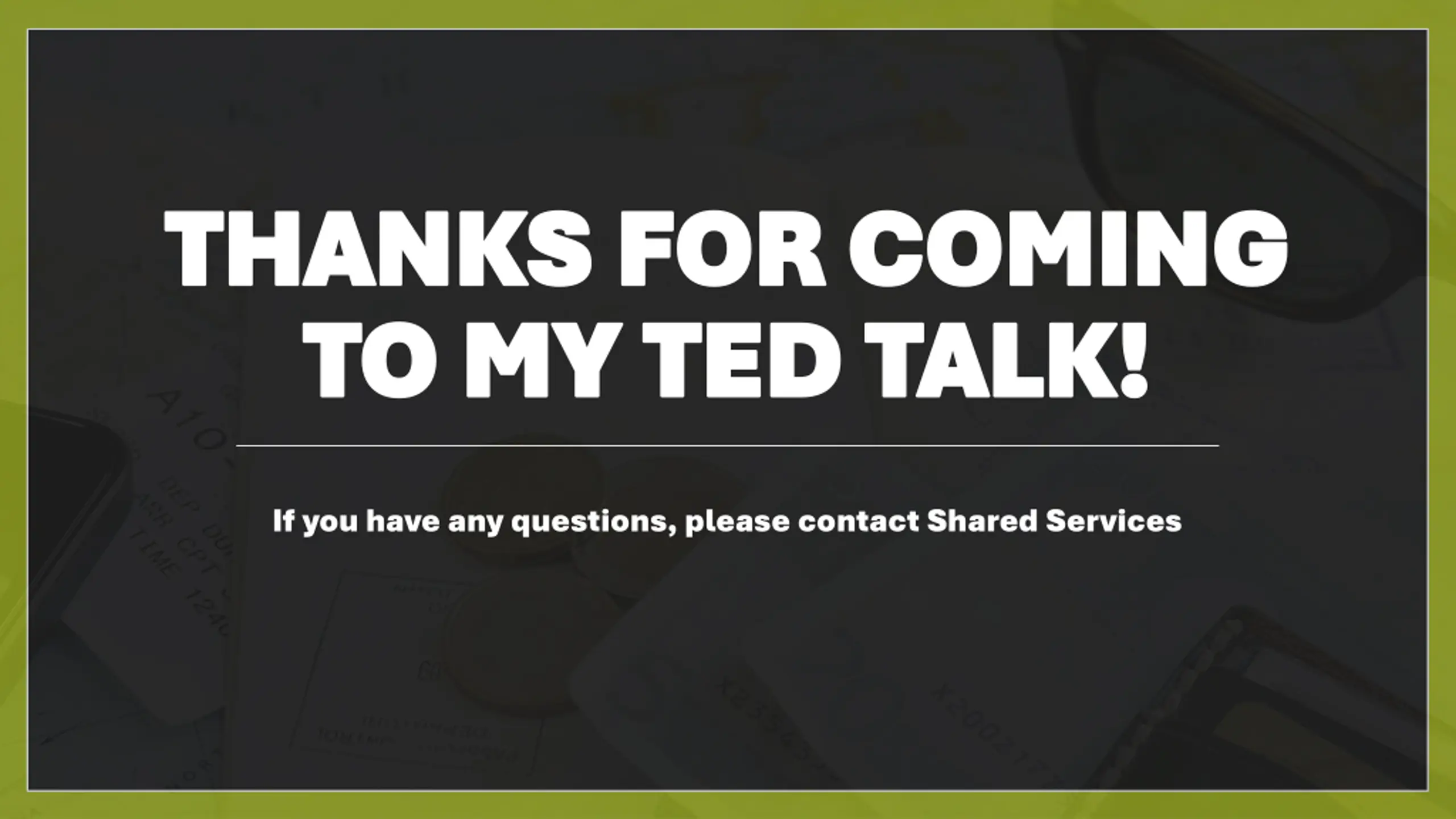 THANKS FOR COMING THANKS FOR COMING TO MY TED TALK! TO MY TED TALK! If you have any questions, please contact Shared Services