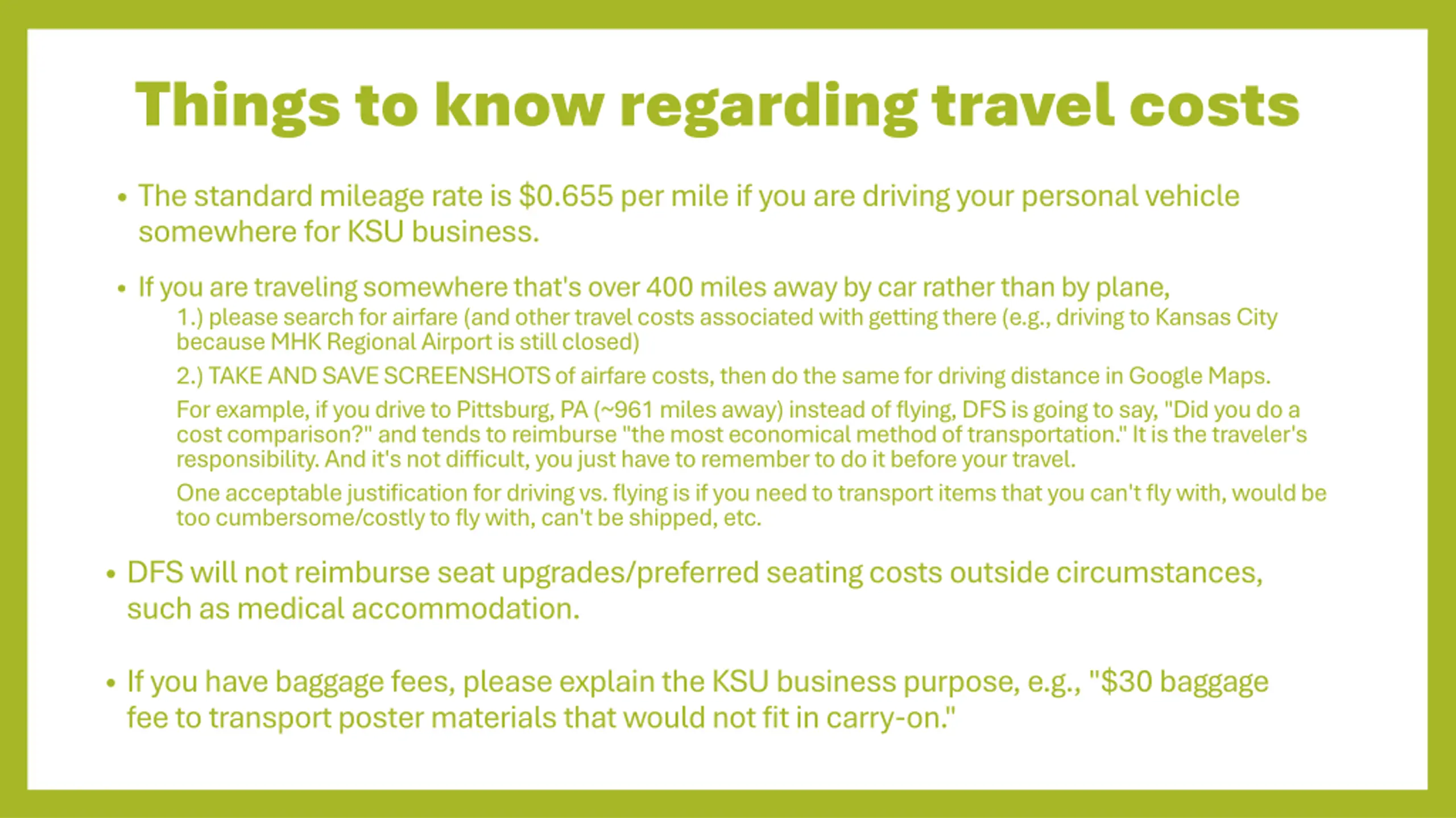 Things to know regarding travel costs The standard mileage rate is $0.655 per mile if you are driving your personal vehicle somewhere for KSU business. If you are traveling somewhere that's over 400 miles away by car rather than by plane, 1.) please search for airfare (and other travel costs associated with getting there (e.g., driving to Kansas City because MHK Regional Airport is still closed) 2.) TAKE AND SAVE SCREENSHOTS of airfare costs, then do the same for driving distance in Google Maps. For example, if you drive to Pittsburg, PA (~961 miles away) instead of flying, DFS is going to say, "Did you do a cost comparison?" and tends to reimburse "the most economical method of transportation." It is the traveler's responsibility. And it's not difficult, you just have to remember to do it before your travel. One acceptable justification for driving vs. flying is if you need to transport items that you can't fly with, would be too cumbersome/costly to fly with, can't be shipped, etc. DFS will not reimburse seat upgrades/preferred seating costs outside circumstances, such as medical accommodation. If you have baggage fees, please explain the KSU business purpose, e.g., "$30 baggage fee to transport poster materials that would not fit in carry-on."