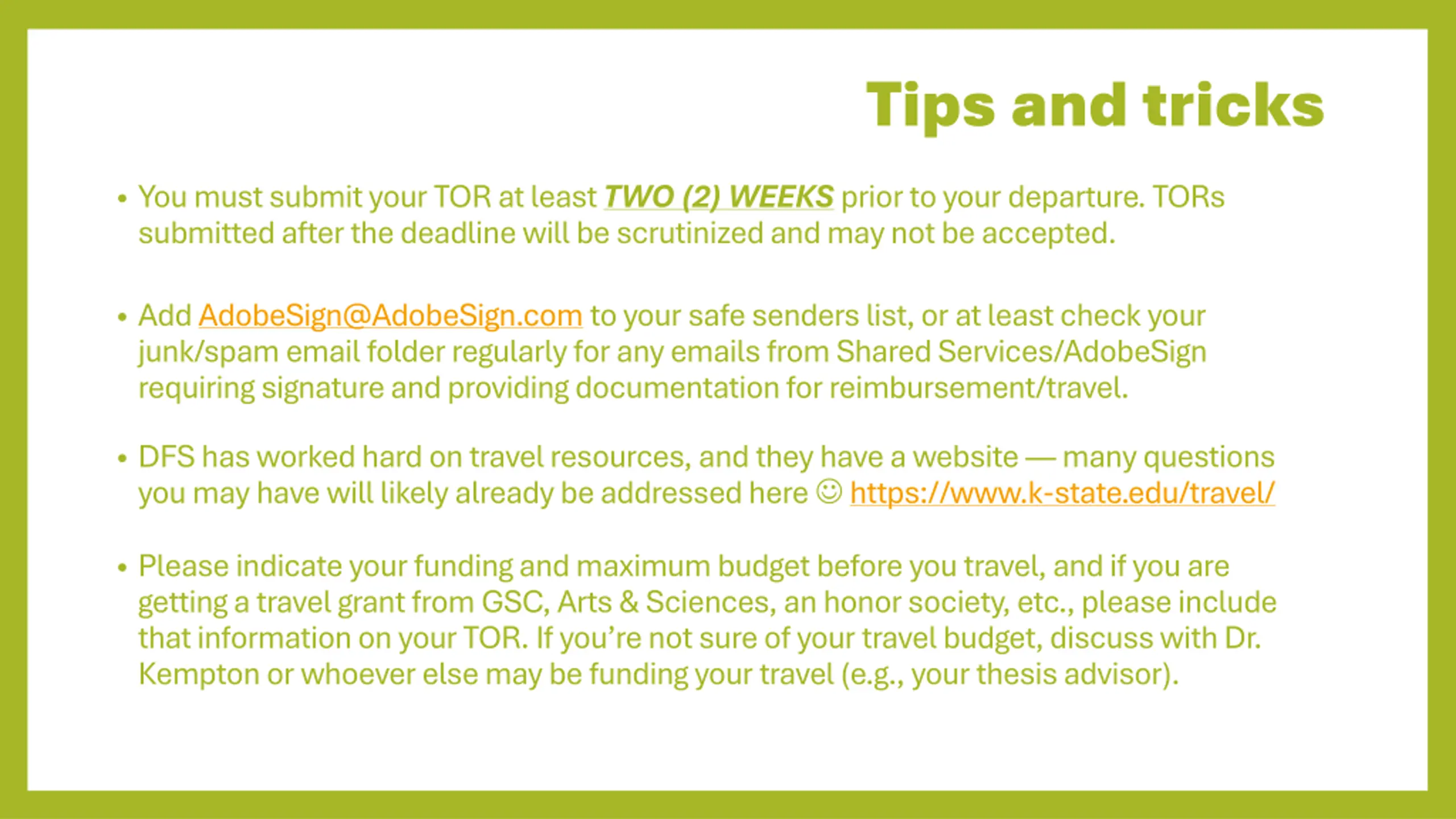 Tips and tricks You must submit your TOR at least TWO (2) WEEKS prior to your departure. TORs submitted after the deadline will be scrutinized and may not be accepted. Add AdobeSign@AdobeSign.com to your safe senders list, or at least check your junk/spam email folder regularly for any emails from Shared Services/AdobeSign requiring signature and providing documentation for reimbursement/travel. DFS has worked hard on travel resources, and they have a website many questions you may have will likely already be addressed here https://www.k-state.edu/travel/ Please indicate your funding and maximum budget before you travel, and if you are getting a travel grant from GSC, Arts & Sciences, an honor society, etc., please include that information on your TOR. If you re not sure of your travel budget, discuss with Dr. Kempton or whoever else may be funding your travel (e.g., your thesis advisor).
