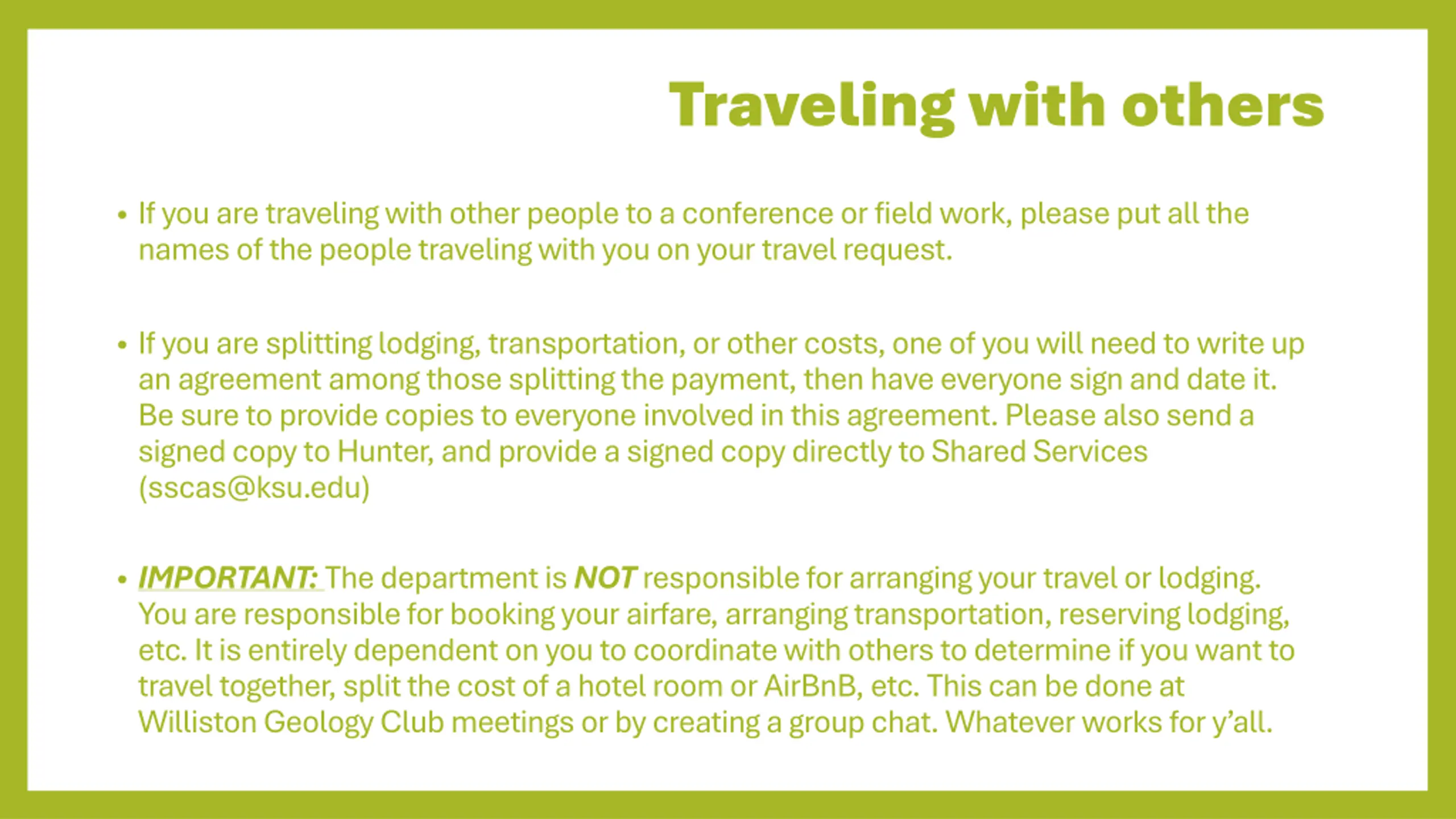 Traveling with others If you are traveling with other people to a conference or field work, please put all the names of the people traveling with you on your travel request. If you are splitting lodging, transportation, or other costs, one of you will need to write up an agreement among those splitting the payment, then have everyone sign and date it. Be sure to provide copies to everyone involved in this agreement. Please also send a signed copy to Hunter, and provide a signed copy directly to Shared Services (sscas@ksu.edu) IMPORTANT: The department is NOT responsible for arranging your travel or lodging. You are responsible for booking your airfare, arranging transportation, reserving lodging, etc. It is entirely dependent on you to coordinate with others to determine if you want to travel together, split the cost of a hotel room or AirBnB, etc. This can be done at Williston Geology Club meetings or by creating a group chat. Whatever works for y all.