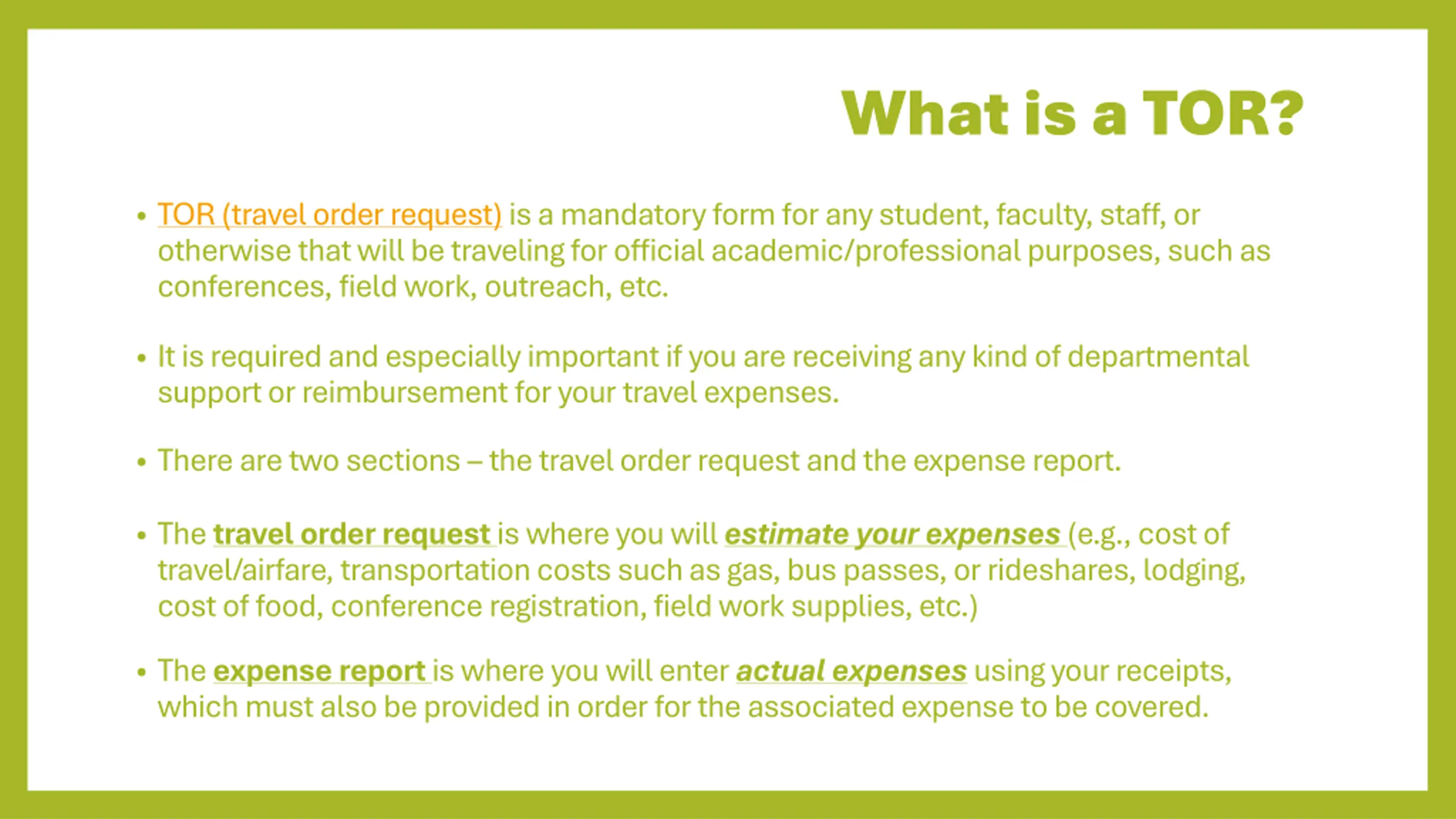 What is a TOR? TOR (travel order request)is a mandatory form for any student, faculty, staff, or otherwise that will be traveling for official academic/professional purposes, such as conferences, field work, outreach, etc. It is required and especially important if you are receiving any kind of departmental support or reimbursement for your travel expenses. There are two sections the travel order request and the expense report. The travel order request is where you will estimate your expenses (e.g., cost of travel/airfare, transportation costs such as gas, bus passes, or rideshares, lodging, cost of food, conference registration, field work supplies, etc.) The expense report is where you will enter actual expenses using your receipts, which must also be provided in order for the associated expense to be covered.