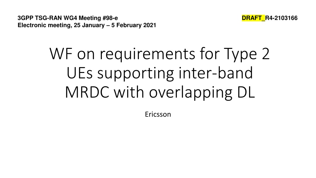 Explore the requirements for Type 2 UEs supporting inter-band MRDC with overlapping DL, focusing on facilitating implementation and ensuring RF performance in non-collocated scenarios. RAN4 considerations for waiving 2Rx/4Rx requirements and specifying RF requirements in the Rel-16 version of 38.101-3 are discussed. References provide additional insights from Ericsson.