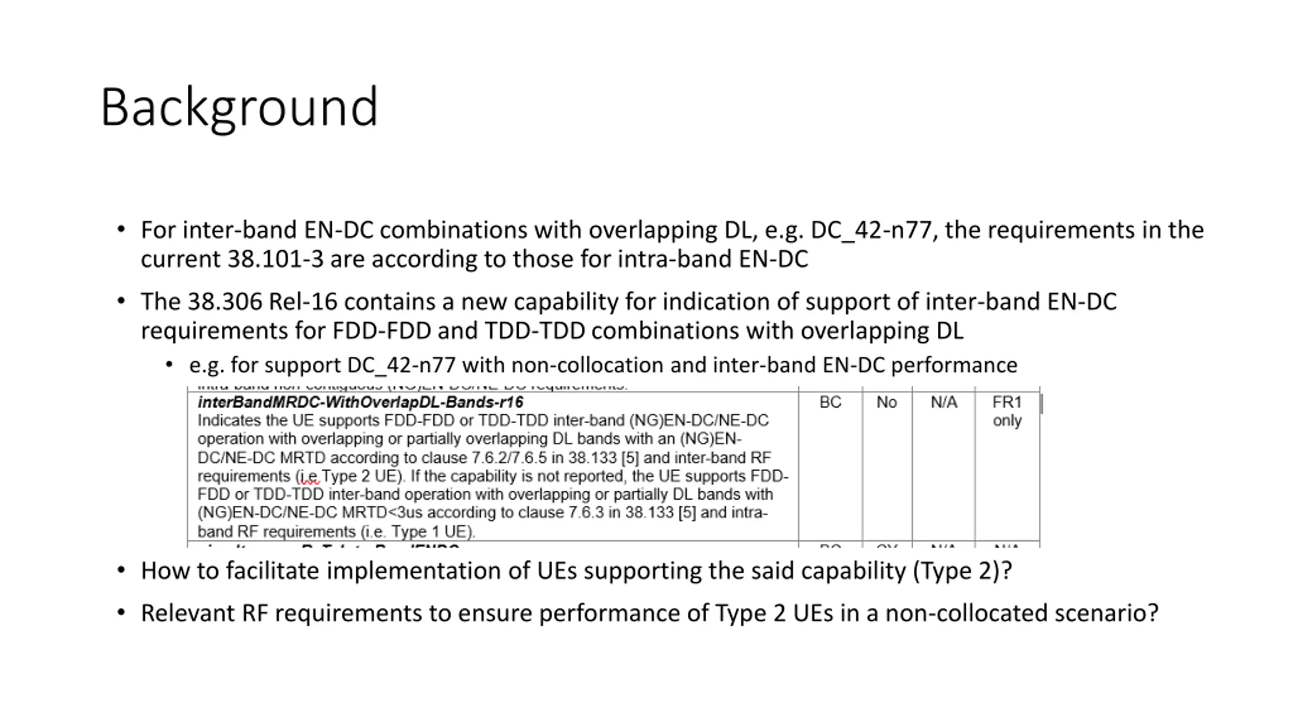 Background For inter-band EN-DC combinations with overlapping DL, e.g. DC_42-n77, the requirements in the current 38.101-3 are according to those for intra-band EN-DC The 38.306 Rel-16 contains a new capability for indication of support of inter-band EN-DC requirements for FDD-FDD and TDD-TDD combinations with overlapping DL e.g. for support DC_42-n77 with non-collocation and inter-band EN-DC performance How to facilitate implementation of UEs supporting the said capability (Type 2)? Relevant RF requirements to ensure performance of Type 2 UEs in a non-collocated scenario?