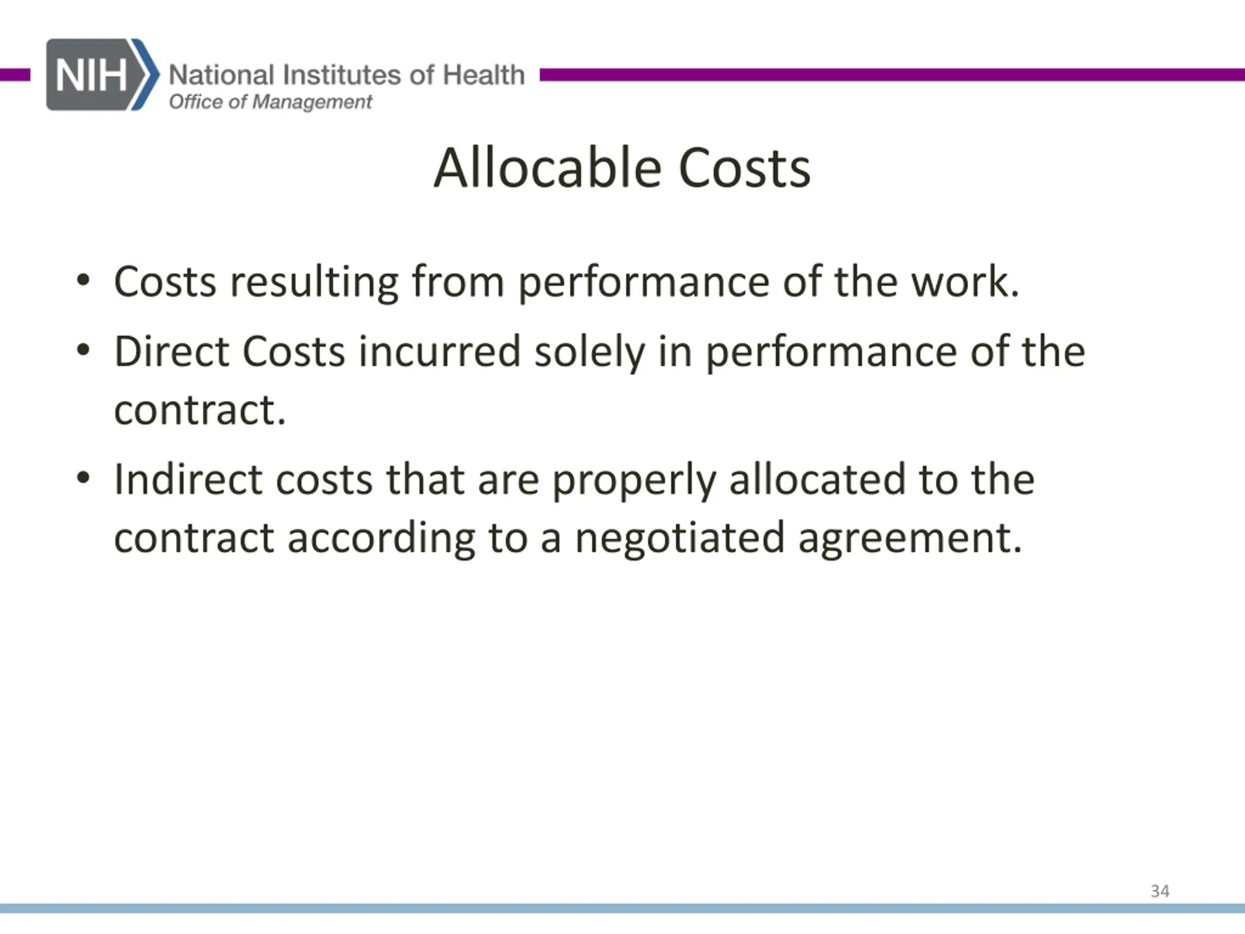 Allocable Costs Costs resulting from performance of the work. Direct Costs incurred solely in performance of the contract. Indirect costs that are properly allocated to the contract according to a negotiated agreement. 34