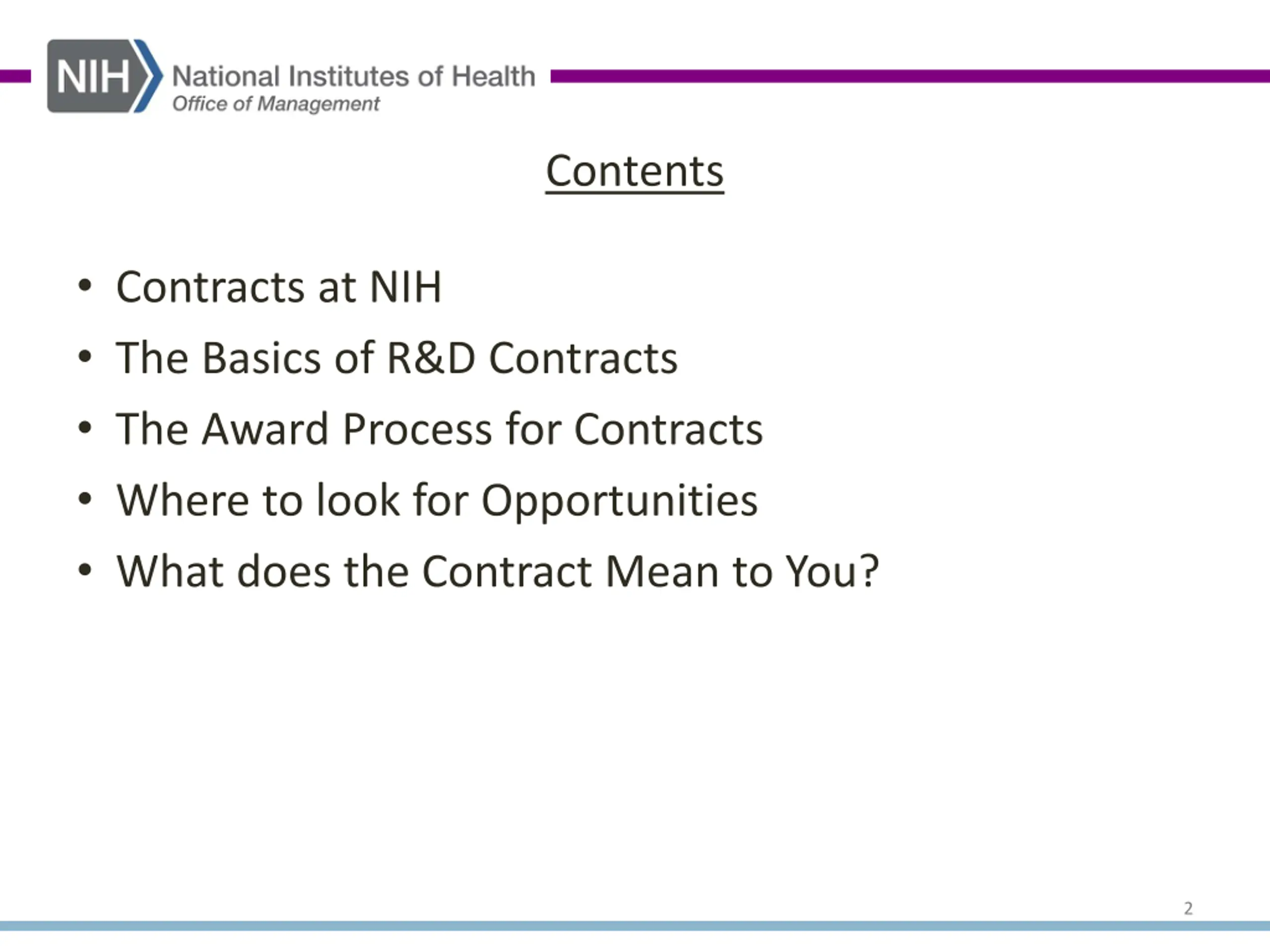 Contents Contracts at NIH The Basics of R&D Contracts The Award Process for Contracts Where to look for Opportunities What does the Contract Mean to You? 2
