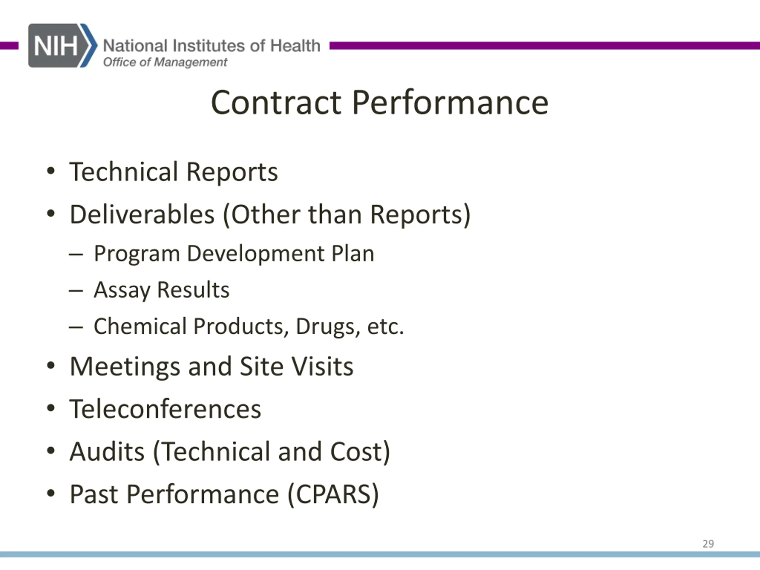 Contract Performance Technical Reports Deliverables (Other than Reports) Program Development Plan Assay Results Chemical Products, Drugs, etc. Meetings and Site Visits Teleconferences Audits (Technical and Cost) Past Performance (CPARS) 29