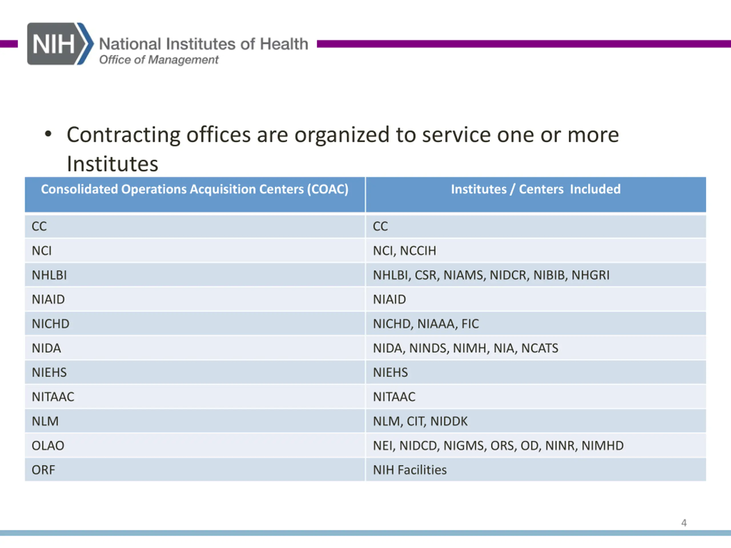 Contracting offices are organized to service one or more Institutes Consolidated Operations Acquisition Centers (COAC) Institutes / Centers Included CC CC NCI NCI, NCCIH NHLBI NHLBI, CSR, NIAMS, NIDCR, NIBIB, NHGRI NIAID NIAID NICHD NICHD, NIAAA, FIC NIDA NIDA, NINDS, NIMH, NIA, NCATS NIEHS NIEHS NITAAC NITAAC NLM NLM, CIT, NIDDK OLAO NEI, NIDCD, NIGMS, ORS, OD, NINR, NIMHD ORF NIH Facilities 4