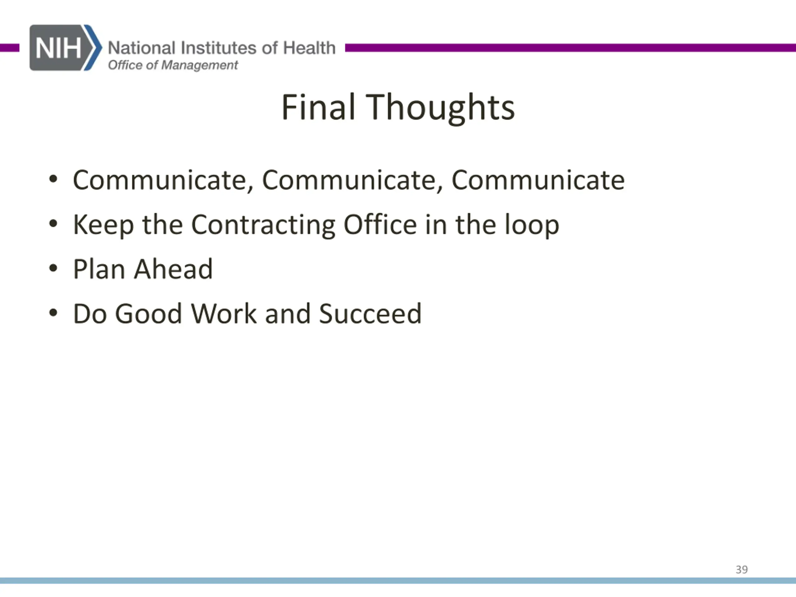 Final Thoughts Communicate, Communicate, Communicate Keep the Contracting Office in the loop Plan Ahead Do Good Work and Succeed 39