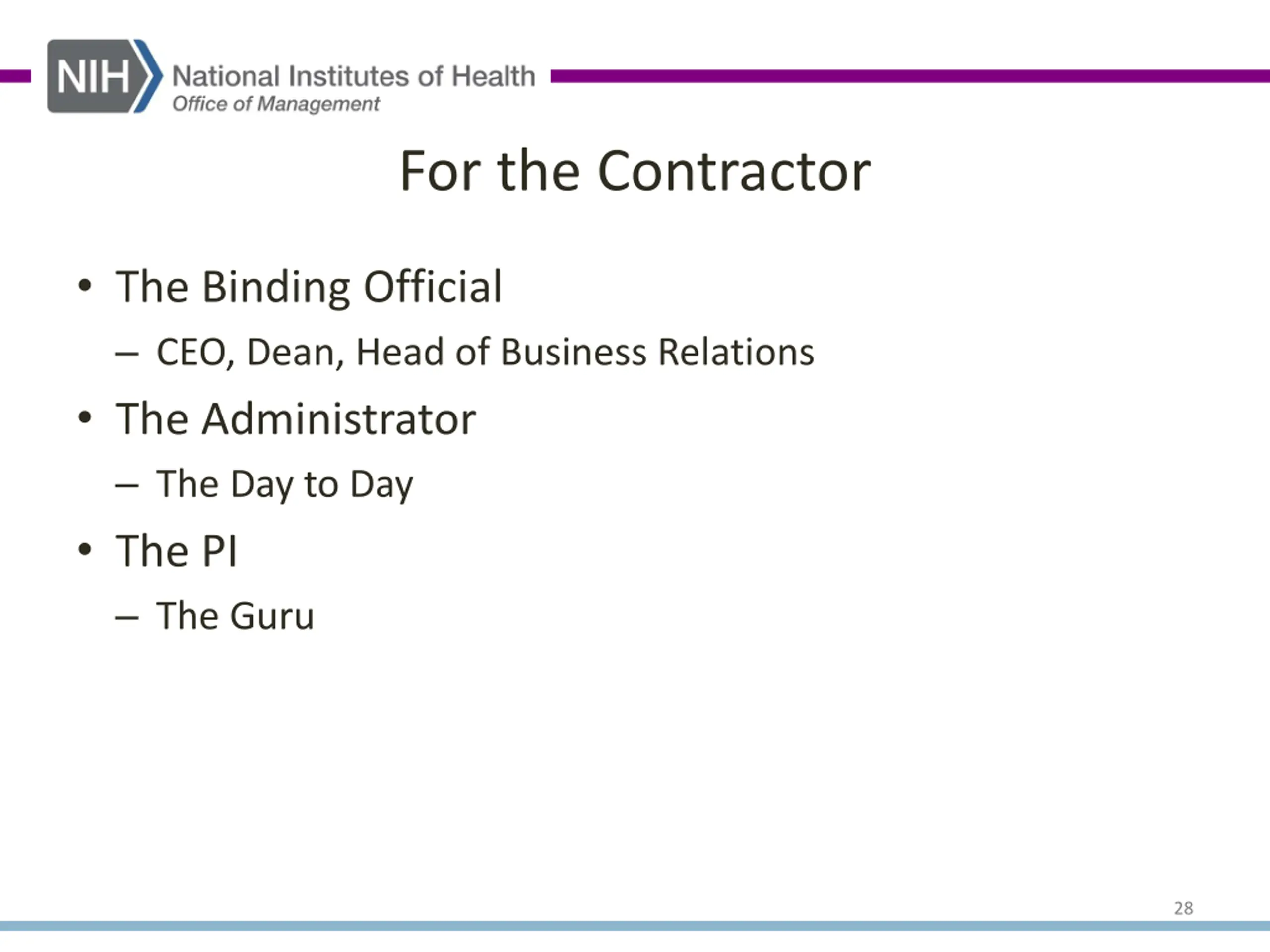 For the Contractor The Binding Official CEO, Dean, Head of Business Relations The Administrator The Day to Day The PI The Guru 28