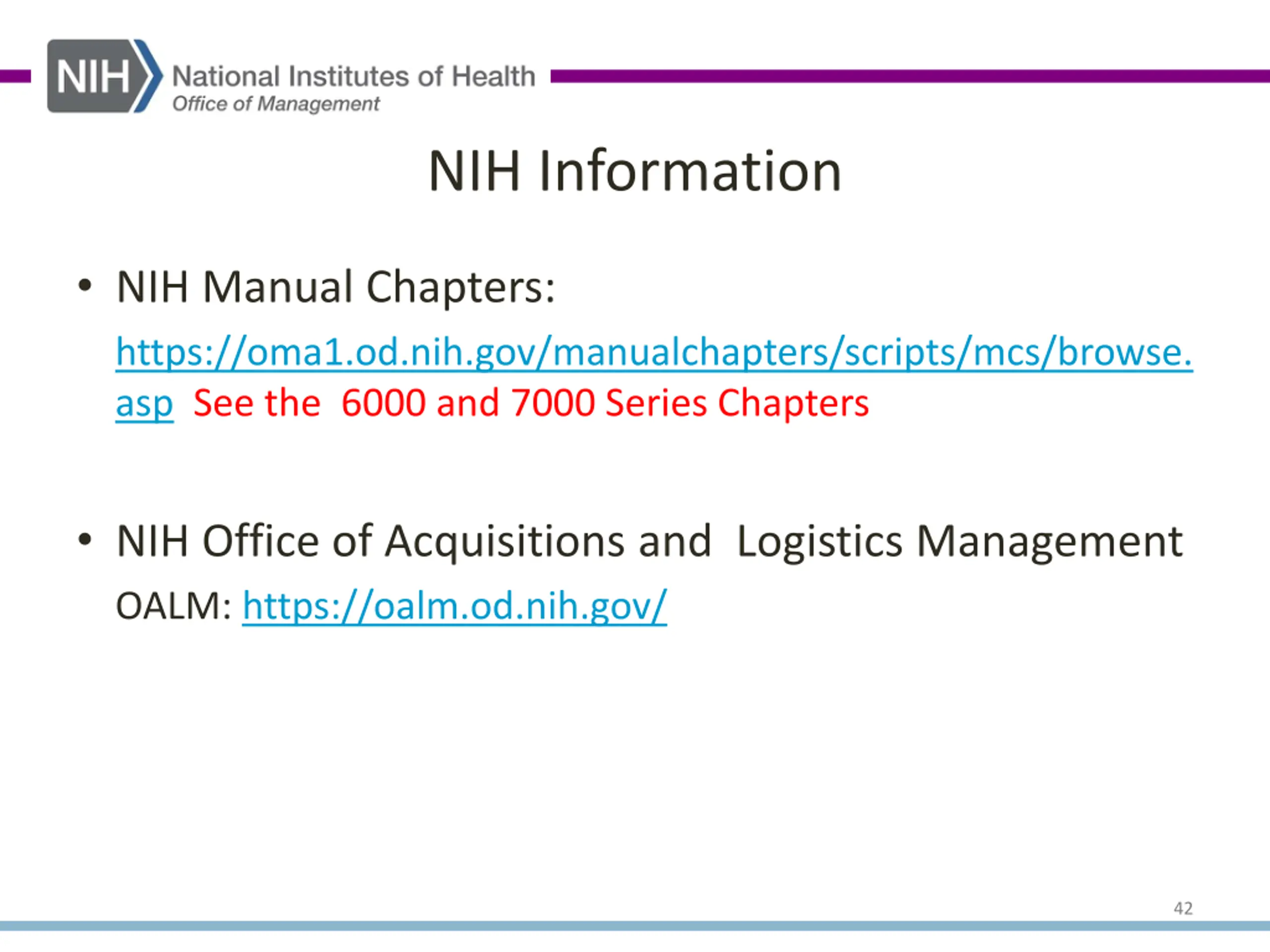 NIH Information NIH Manual Chapters: https://oma1.od.nih.gov/manualchapters/scripts/mcs/browse. asp See the 6000 and 7000 Series Chapters NIH Office of Acquisitions and Logistics Management OALM: https://oalm.od.nih.gov/ 42
