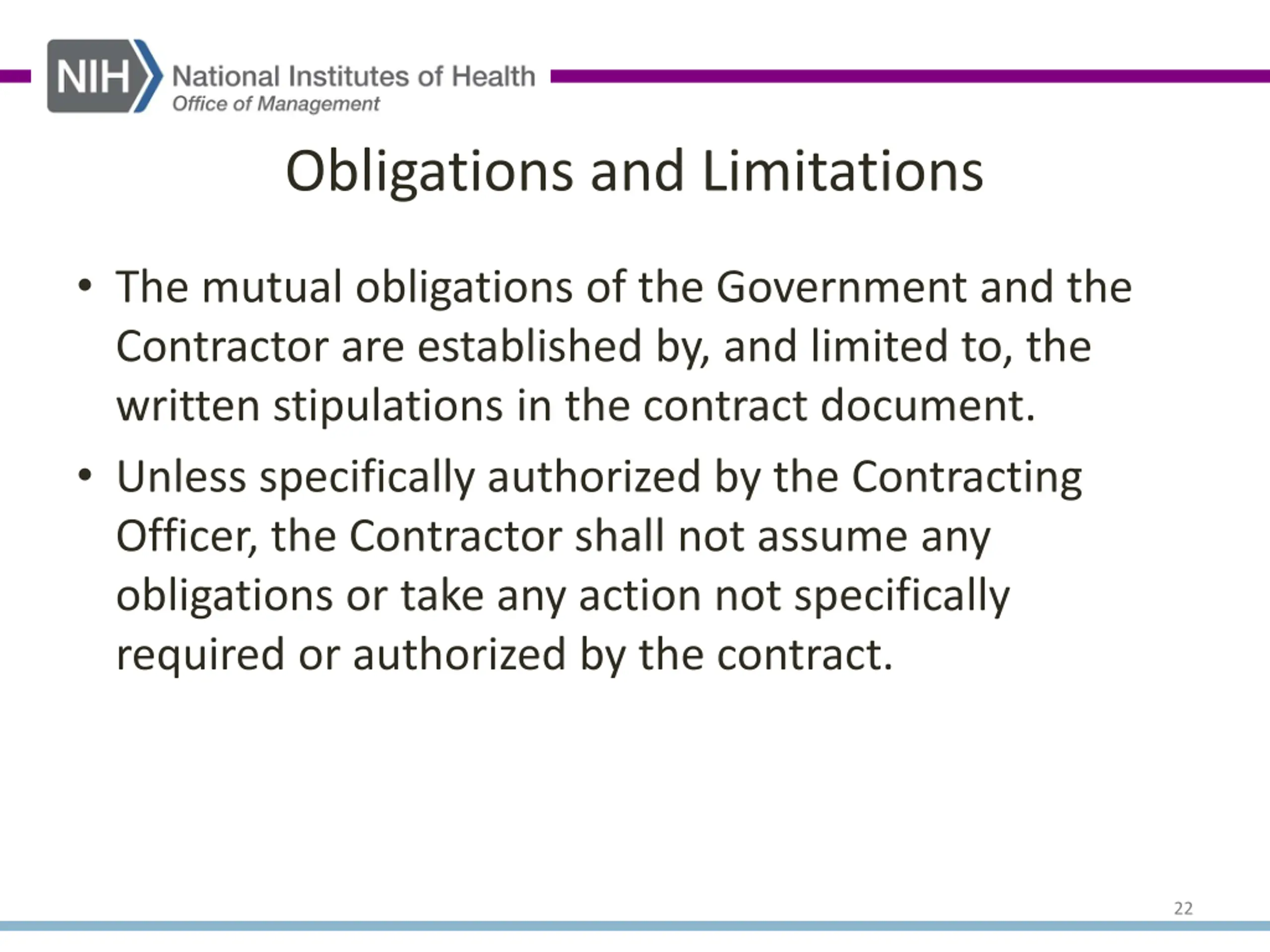 Obligations and Limitations The mutual obligations of the Government and the Contractor are established by, and limited to, the written stipulations in the contract document. Unless specifically authorized by the Contracting Officer, the Contractor shall not assume any obligations or take any action not specifically required or authorized by the contract. 22