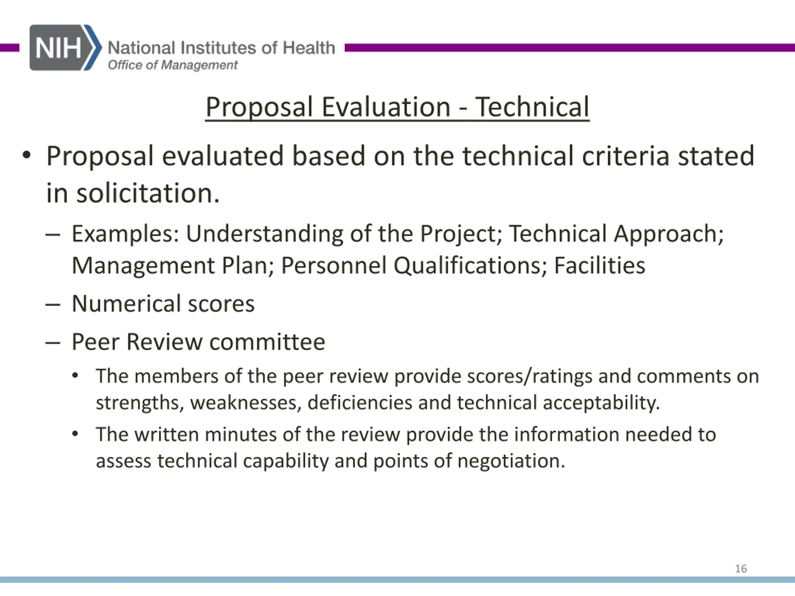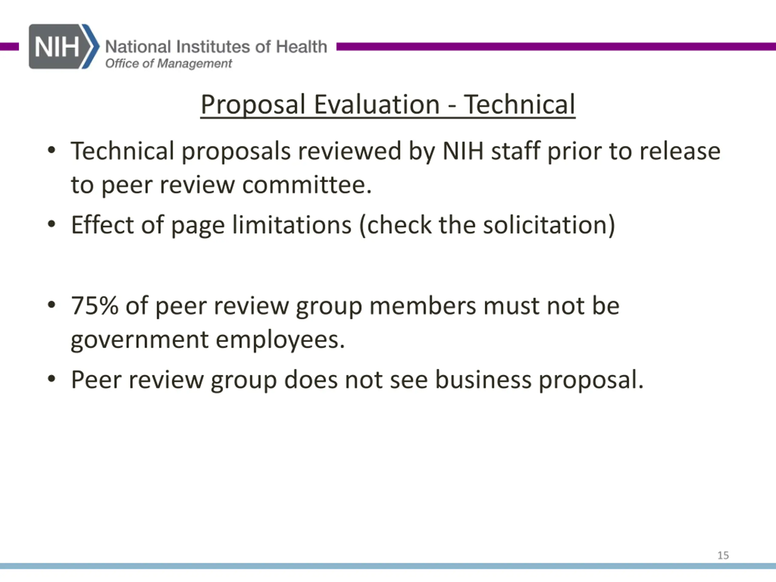 Proposal Evaluation - Technical Technical proposals reviewed by NIH staff prior to release to peer review committee. Effect of page limitations (check the solicitation) 75% of peer review group members must not be government employees. Peer review group does not see business proposal. 15