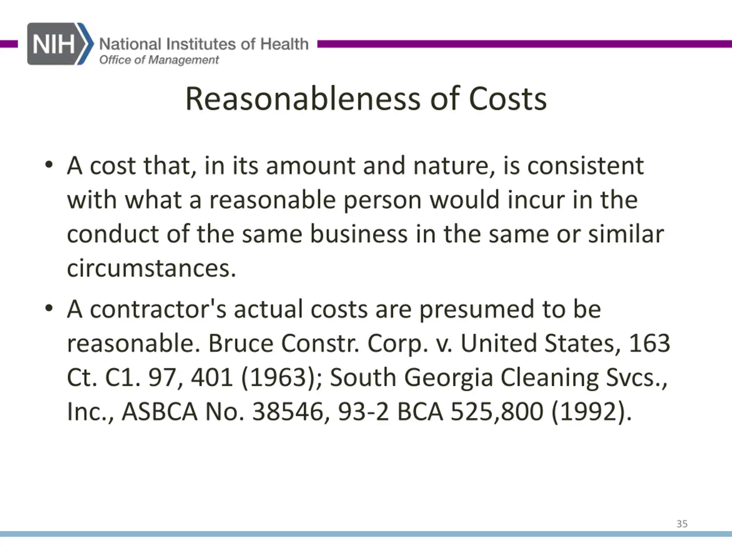 Reasonableness of Costs A cost that, in its amount and nature, is consistent with what a reasonable person would incur in the conduct of the same business in the same or similar circumstances. A contractor's actual costs are presumed to be reasonable. Bruce Constr. Corp. v. United States, 163 Ct. C1. 97, 401 (1963); South Georgia Cleaning Svcs., Inc., ASBCA No. 38546, 93-2 BCA 525,800 (1992). 35
