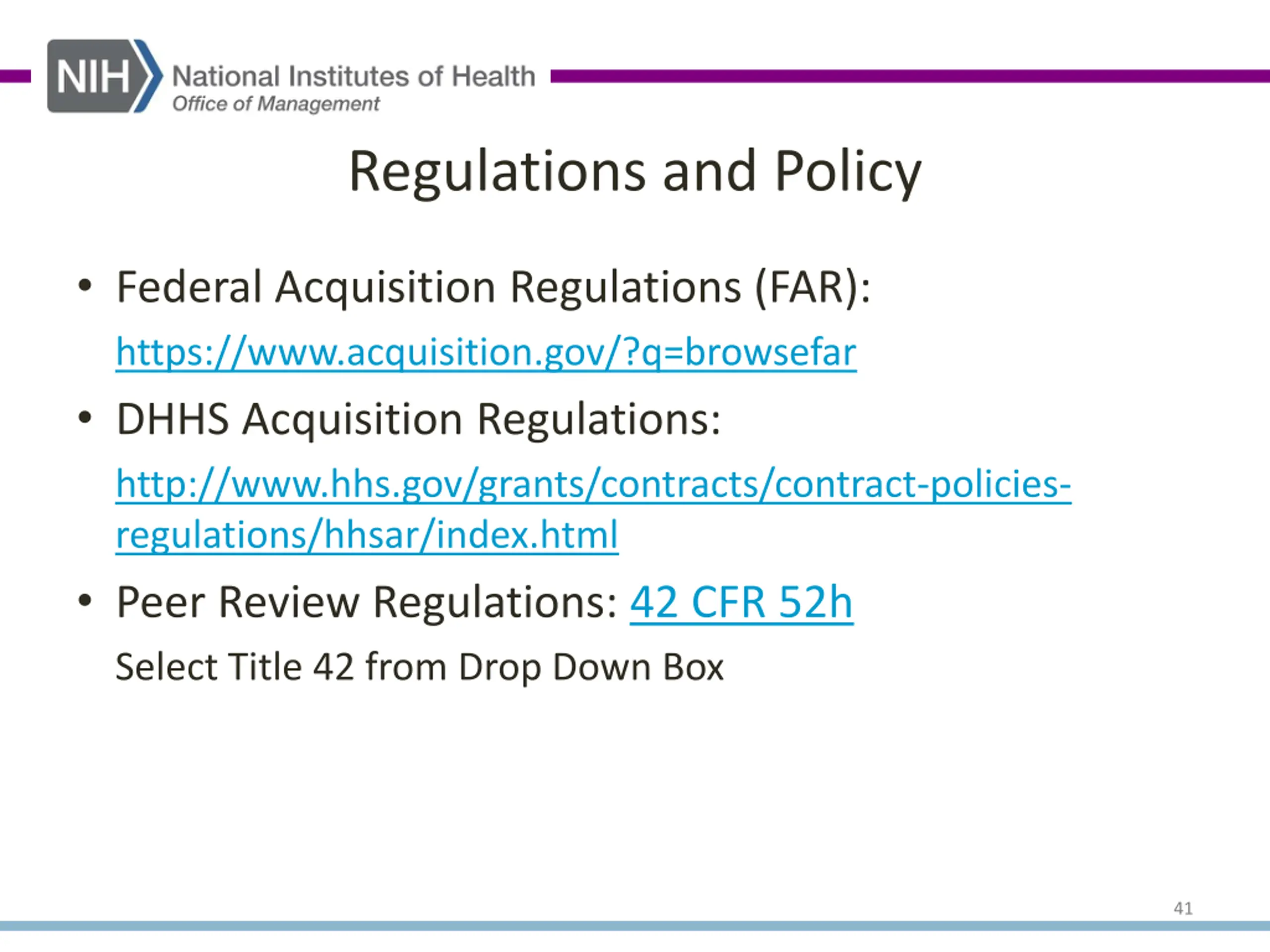 Regulations and Policy Federal Acquisition Regulations (FAR): https://www.acquisition.gov/?q=browsefar DHHS Acquisition Regulations: http://www.hhs.gov/grants/contracts/contract-policies- regulations/hhsar/index.html Peer Review Regulations: 42 CFR 52h Select Title 42 from Drop Down Box 41