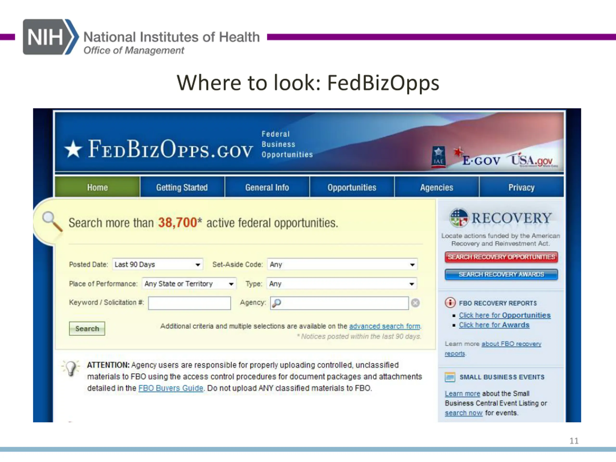 Examples of NIH R&D Contracts Therapeutics against pathogens Vaccine development (e.g. ebola vaccine) Animal research support (e.g. animal model development) Protocol development Clinical research studies Reagent development Clinical data coordination Biologic specimen repository 10