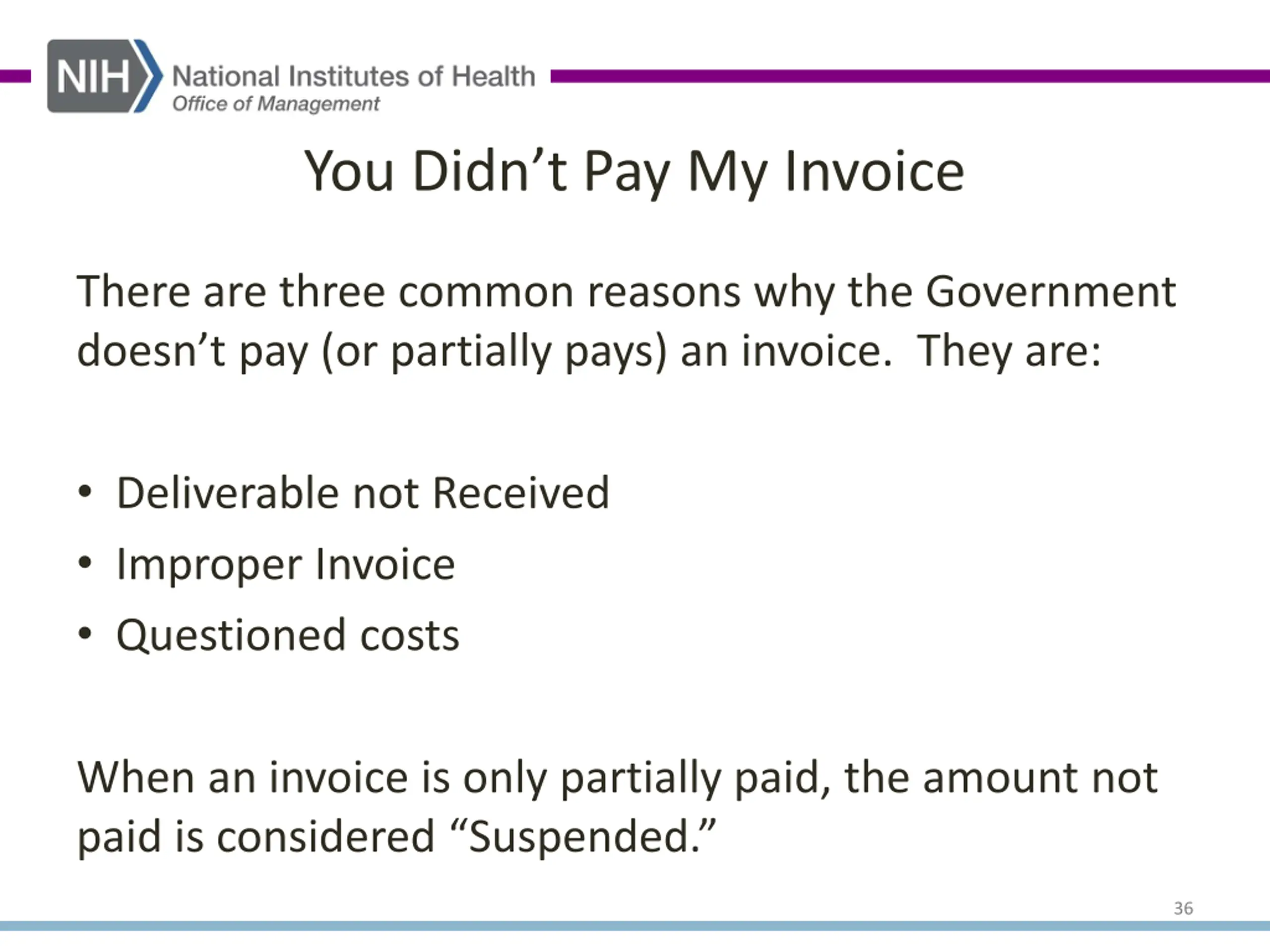 You Didnt Pay My Invoice There are three common reasons why the Government doesn t pay (or partially pays) an invoice. They are: Deliverable not Received Improper Invoice Questioned costs When an invoice is only partially paid, the amount not paid is considered Suspended. 36