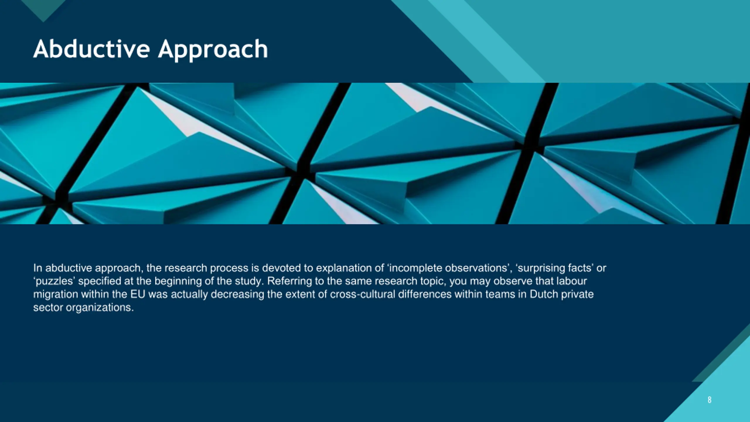 Click to edit Master title style Abductive Approach In abductive approach, the research process is devoted to explanation of incomplete observations , surprising facts or puzzles specified at the beginning of the study. Referring to the same research topic, you may observe that labour migration within the EU was actually decreasing the extent of cross-cultural differences within teams in Dutch private sector organizations. 8 8