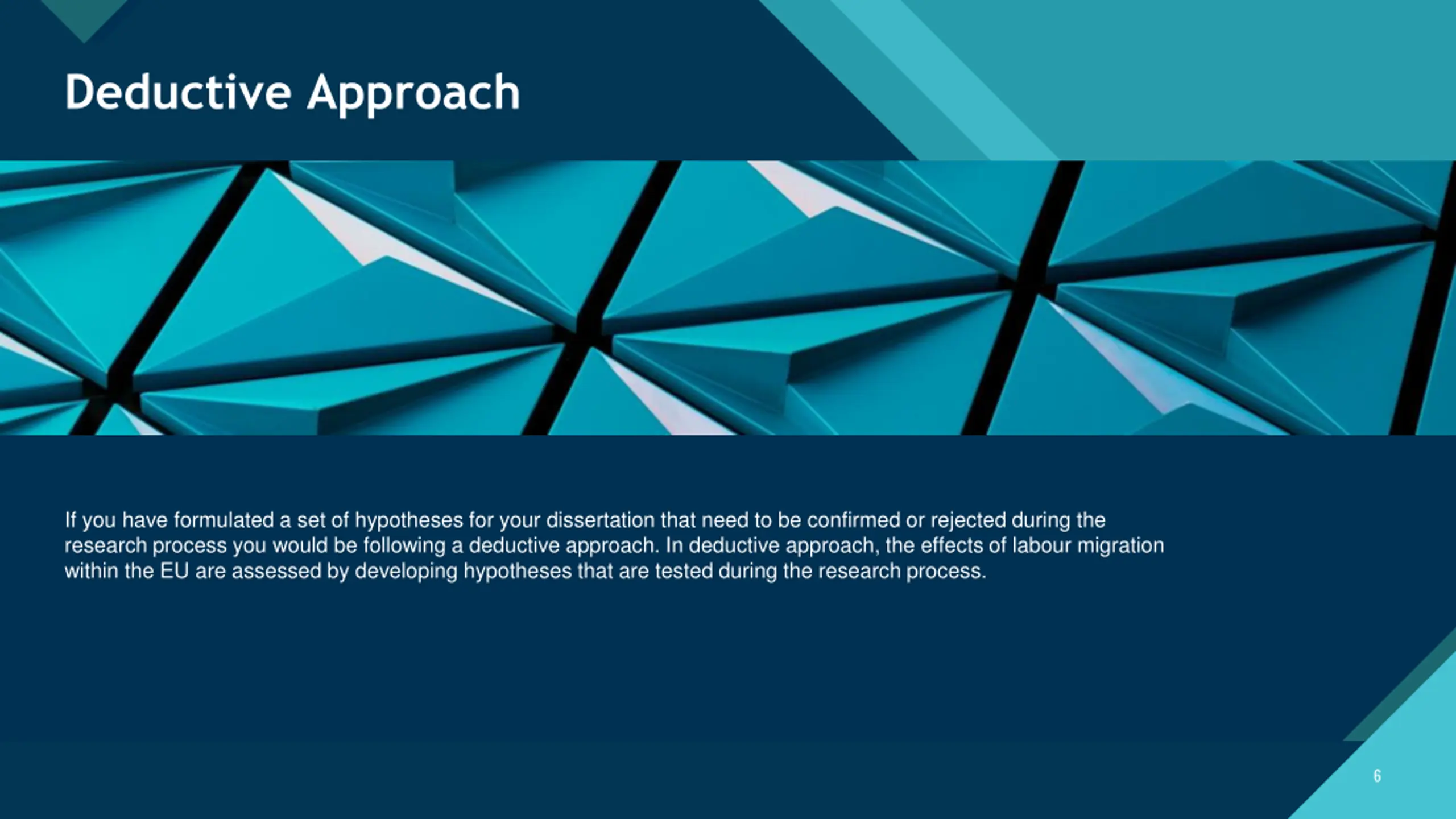Click to edit Master title style Deductive Approach If you have formulated a set of hypotheses for your dissertation that need to be confirmed or rejected during the research process you would be following a deductive approach. In deductive approach, the effects of labour migration within the EU are assessed by developing hypotheses that are tested during the research process. 6 6