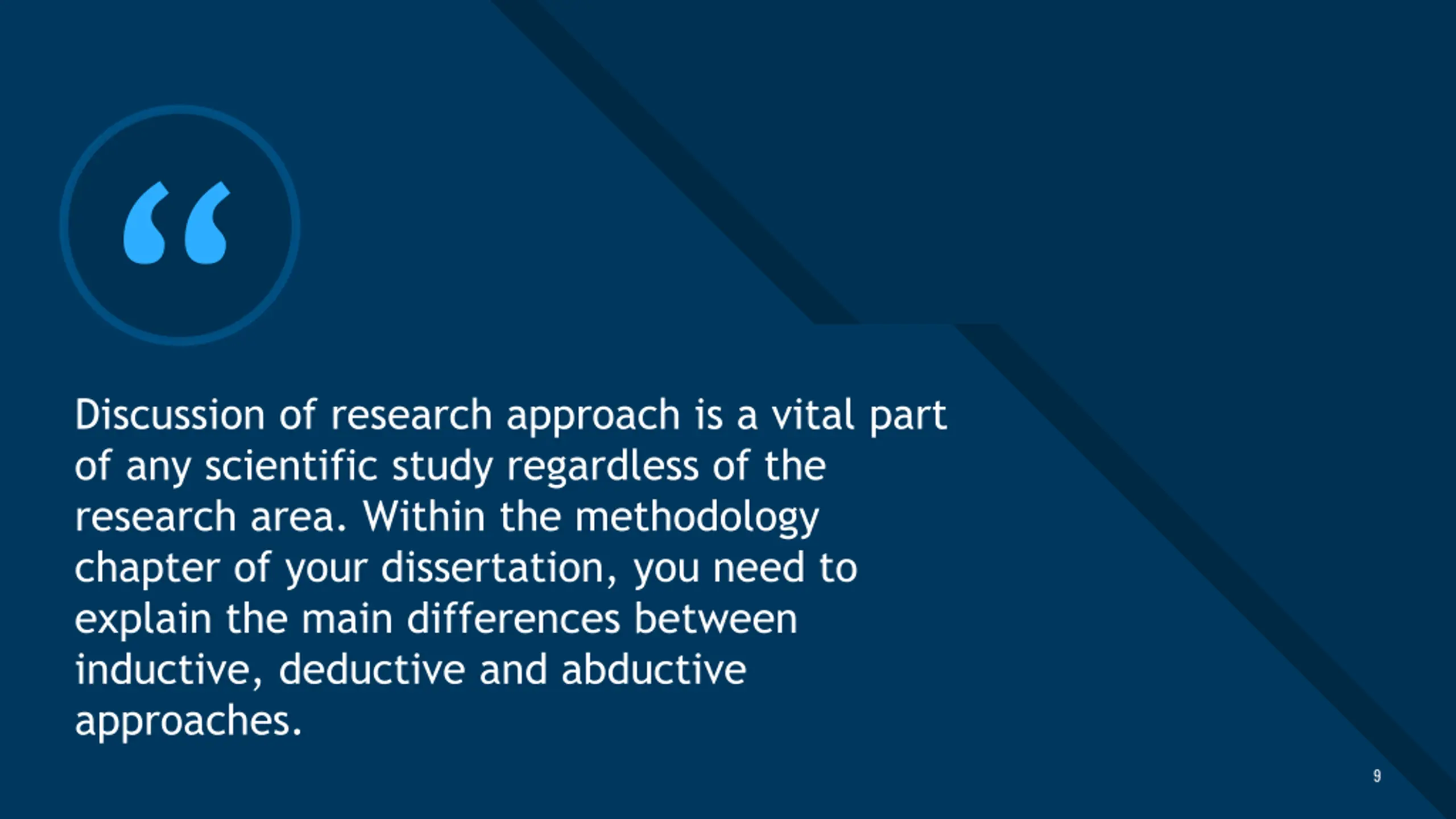 Click to edit Master title style Discussion of research approach is a vital part of any scientific study regardless of the research area. Within the methodology chapter of your dissertation, you need to explain the main differences between inductive, deductive and abductive approaches. 9 9