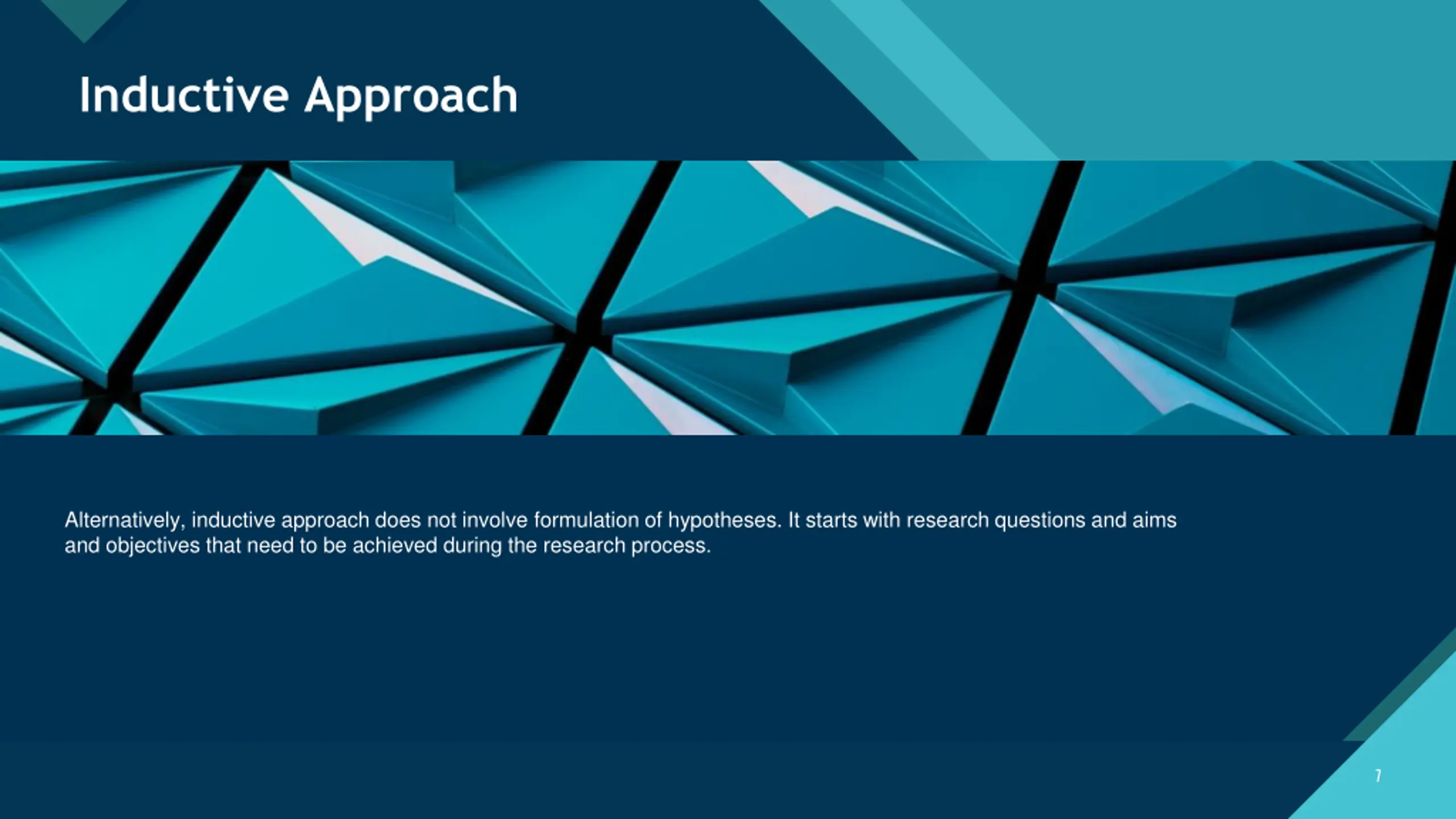 Click to edit Master title style Inductive Approach Alternatively, inductive approach does not involve formulation of hypotheses. It starts with research questions and aims and objectives that need to be achieved during the research process. 7 7