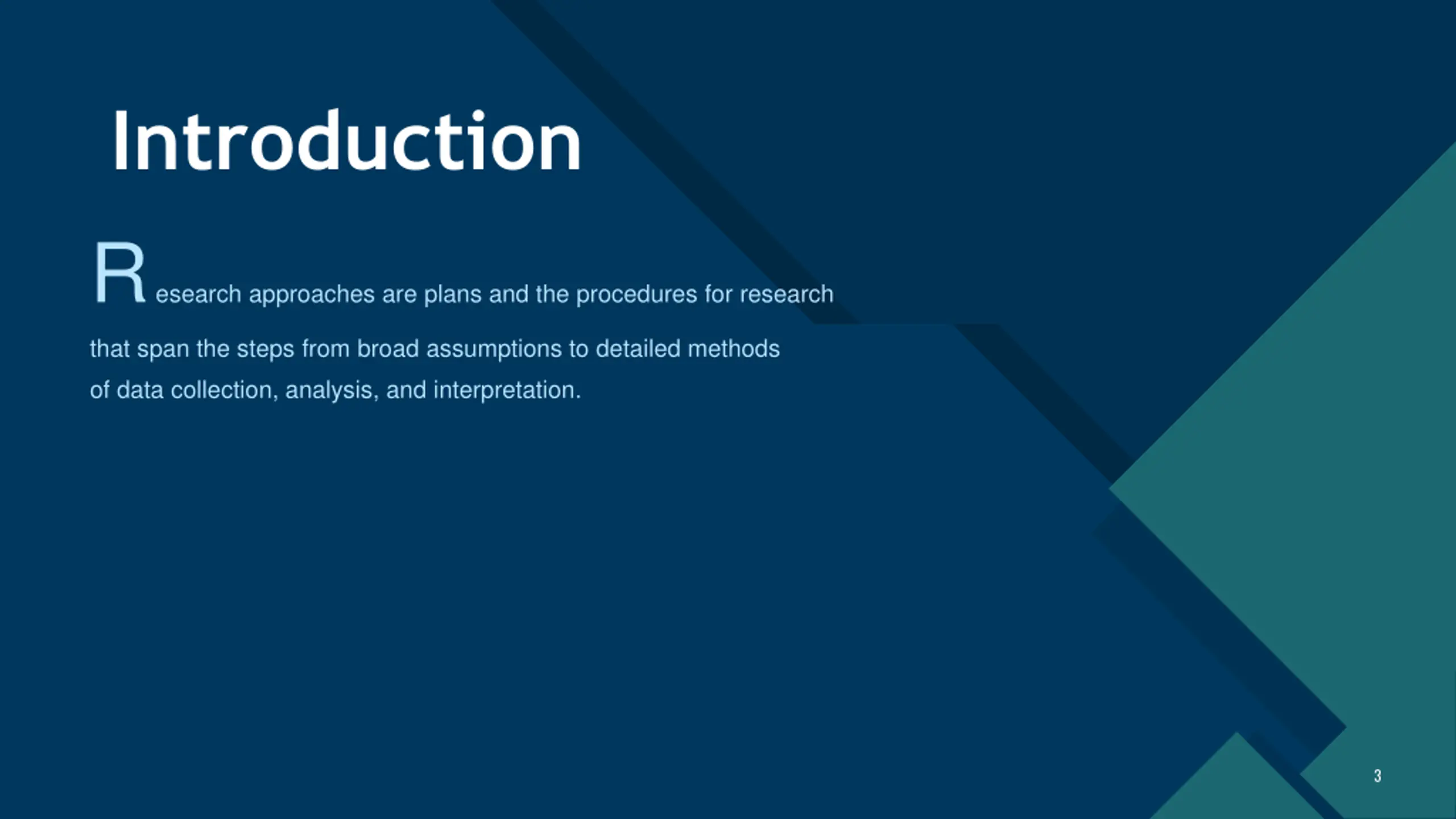 Click to edit Master title style Introduction R esearch approaches are plans and the procedures for research that span the steps from broad assumptions to detailed methods of data collection, analysis, and interpretation. 3 3