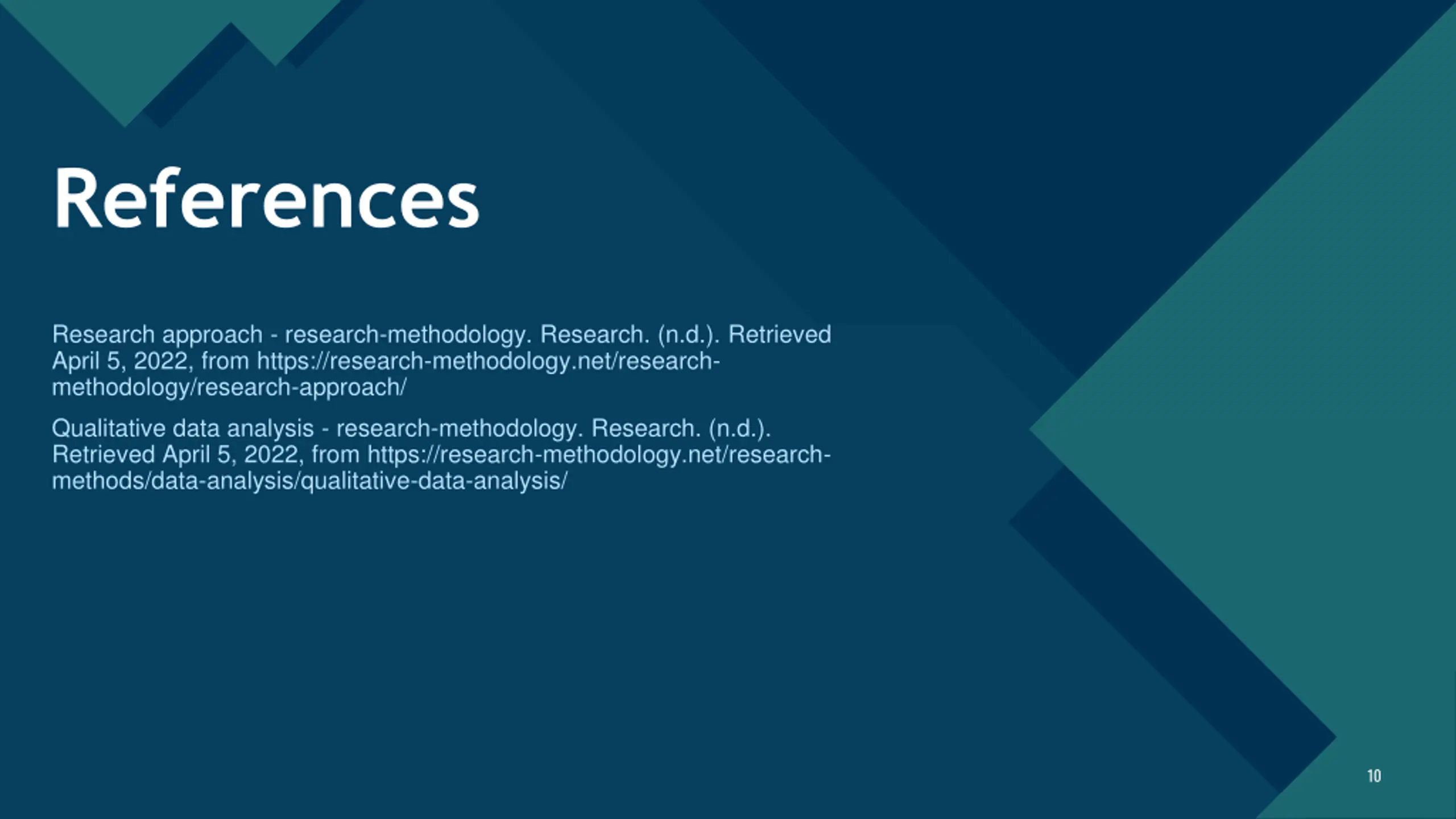 Click to edit Master title style References Research approach - research-methodology. Research. (n.d.). Retrieved April 5, 2022, from https://research-methodology.net/research- methodology/research-approach/ Qualitative data analysis - research-methodology. Research. (n.d.). Retrieved April 5, 2022, from https://research-methodology.net/research- methods/data-analysis/qualitative-data-analysis/ 10 10