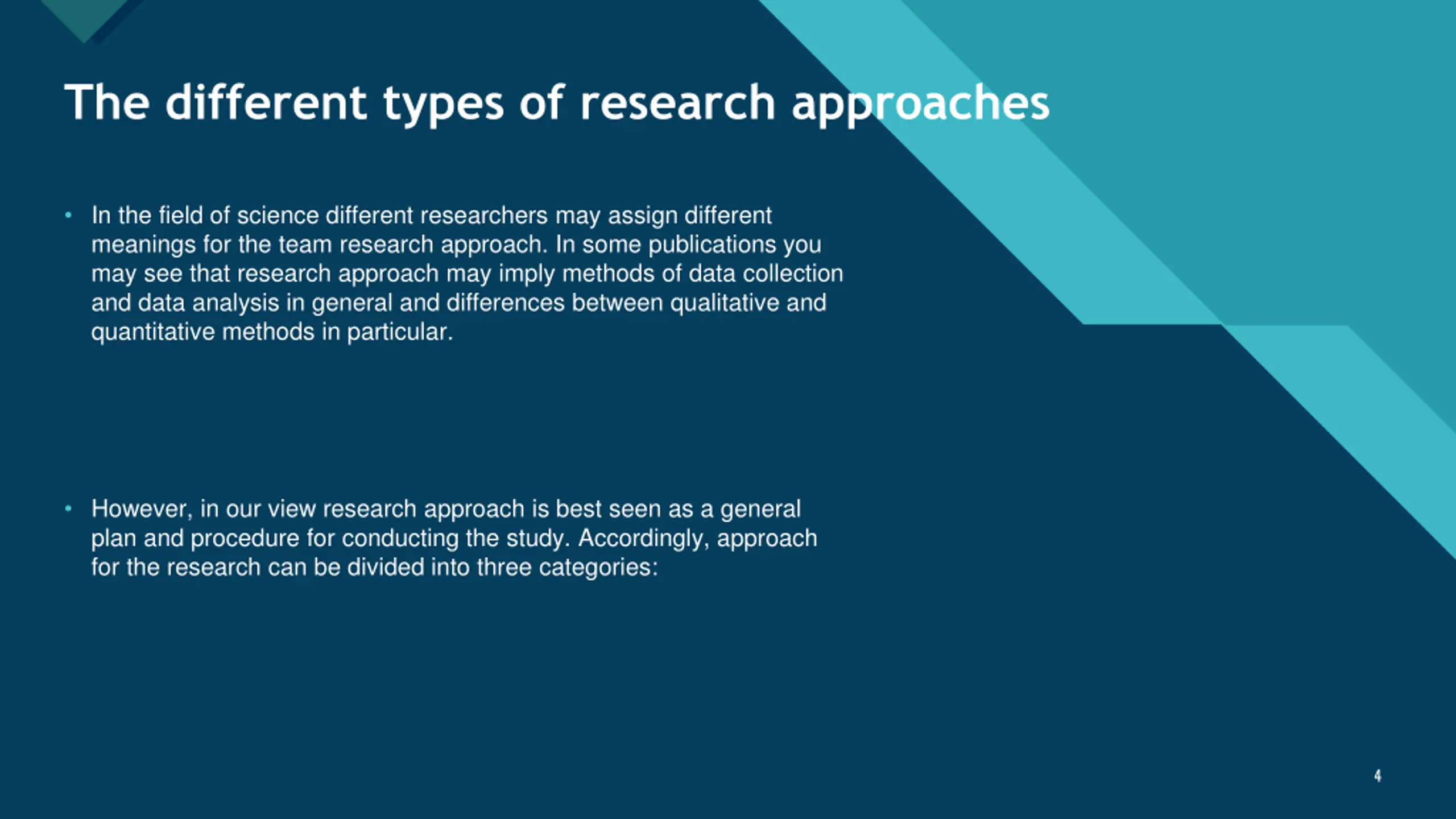 Click to edit Master title style The different types of research approaches In the field of science different researchers may assign different meanings for the team research approach. In some publications you may see that research approach may imply methods of data collection and data analysis in general and differences between qualitative and quantitative methods in particular. However, in our view research approach is best seen as a general plan and procedure for conducting the study. Accordingly, approach for the research can be divided into three categories: 4 4
