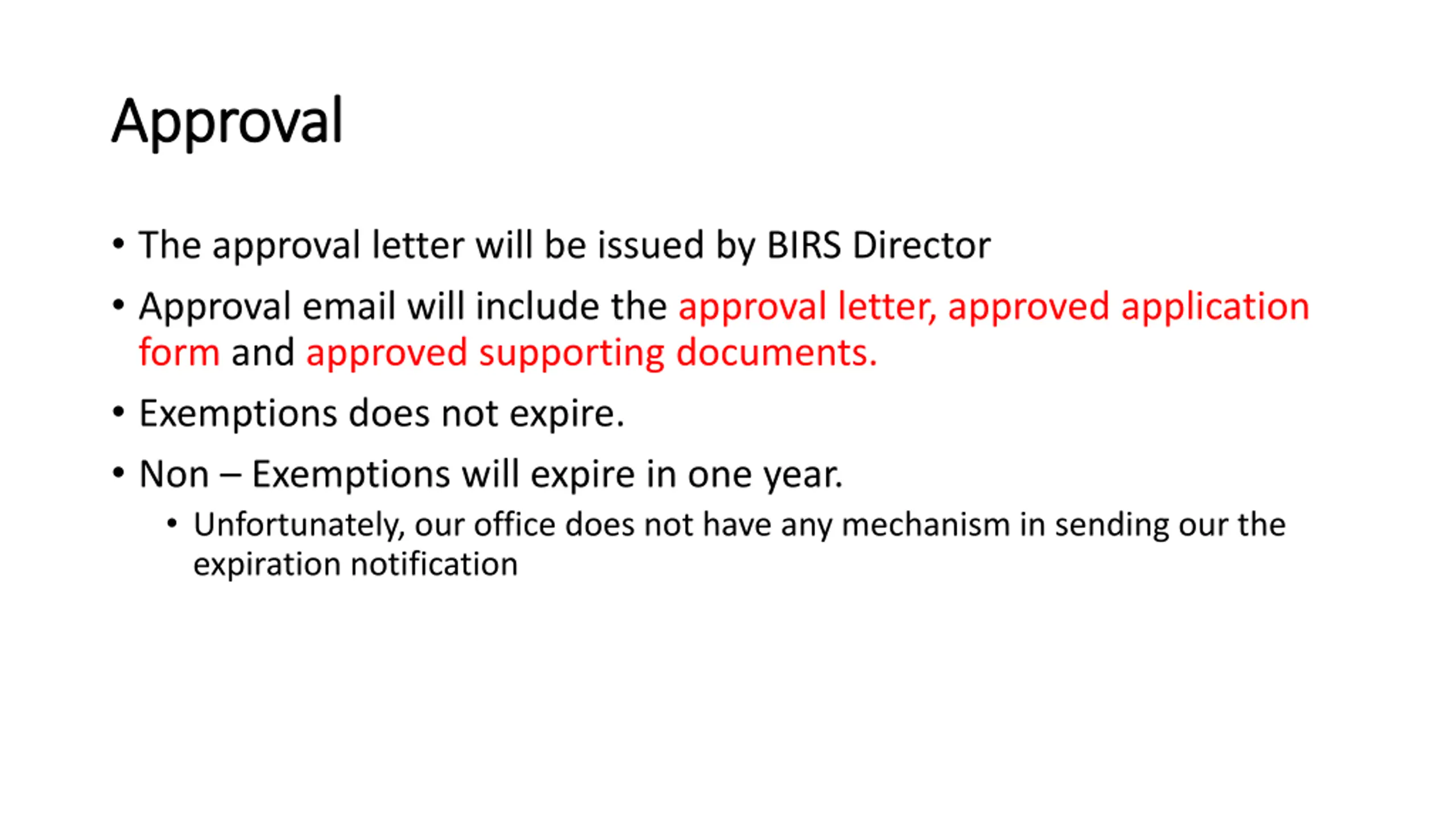Approval Approval The approval letter will be issued by BIRS Director Approval email will include the approval letter, approved application form and approved supporting documents. Exemptions does not expire. Non Exemptions will expire in one year. Unfortunately, our office does not have any mechanism in sending our the expiration notification