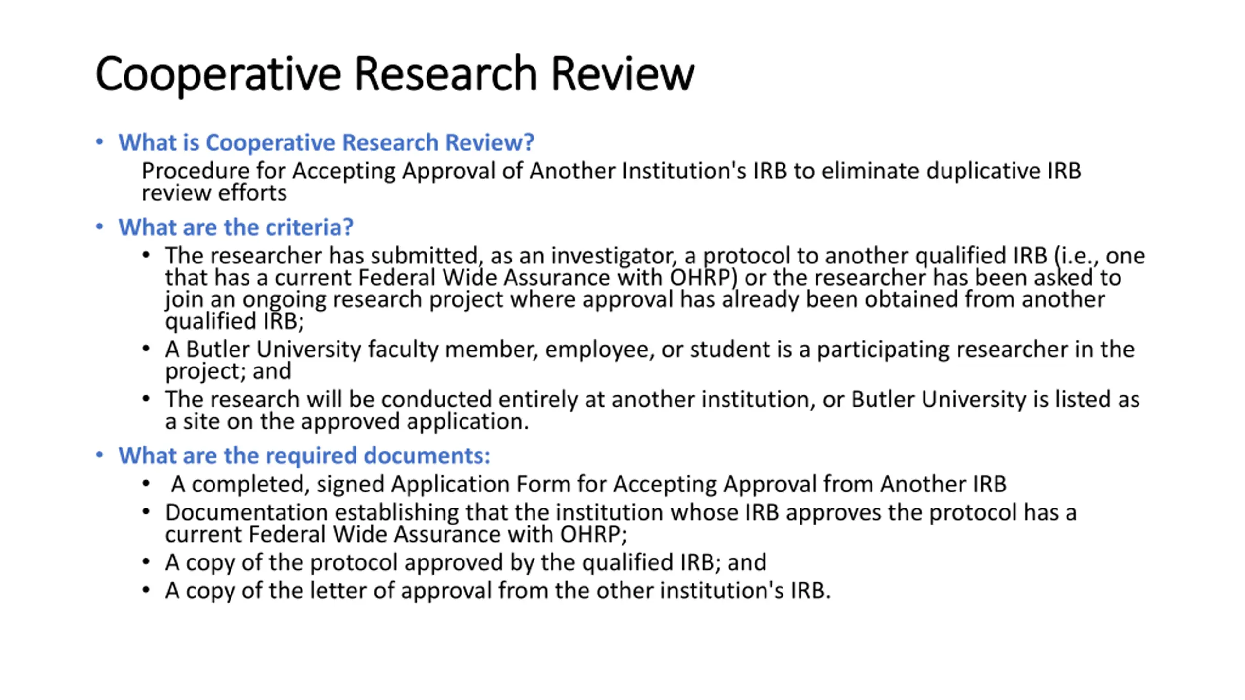 Cooperative Cooperative Research Research Review Review What is Cooperative Research Review? Procedure for Accepting Approval of Another Institution's IRB to eliminate duplicative IRB review efforts What are the criteria? The researcher has submitted, as an investigator, a protocol to another qualified IRB (i.e., one that has a current Federal Wide Assurance with OHRP) or the researcher has been asked to join an ongoing research project where approval has already been obtained from another qualified IRB; A Butler University faculty member, employee, or student is a participating researcher in the project; and The research will be conducted entirely at another institution, or Butler University is listed as a site on the approved application. What are the required documents: A completed, signed Application Form for Accepting Approval from Another IRB Documentation establishing that the institution whose IRB approves the protocol has a current Federal Wide Assurance with OHRP; A copy of the protocol approved by the qualified IRB; and A copy of the letter of approval from the other institution's IRB.