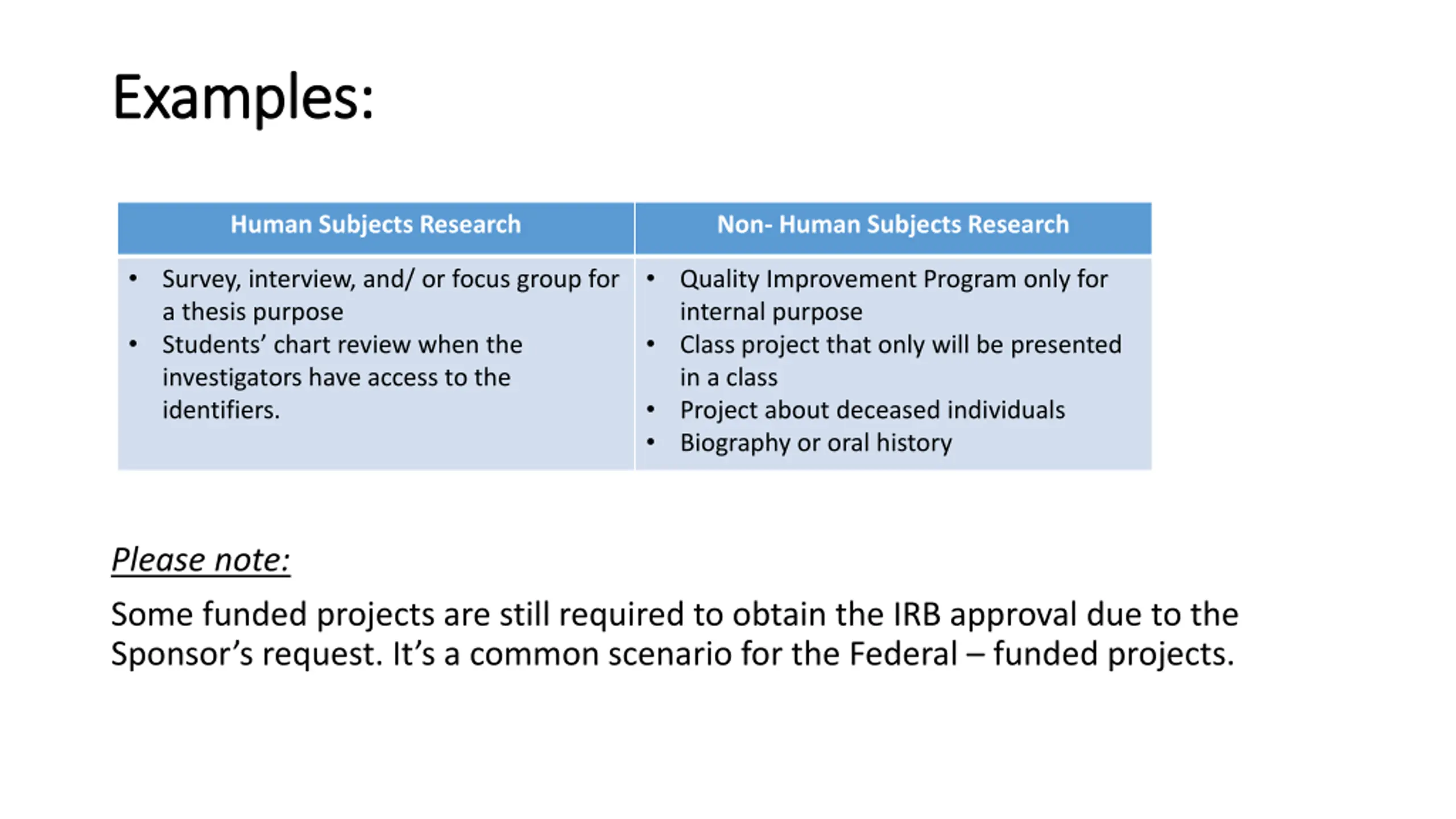 Examples: Examples: Human Subjects Research Non- Human Subjects Research Survey, interview, and/ or focus group for a thesis purpose Students chart review when the investigators have access to the identifiers. Quality Improvement Program only for internal purpose Class project that only will be presented in a class Project about deceased individuals Biography or oral history Please note: Some funded projects are still required to obtain the IRB approval due to the Sponsor s request. It s a common scenario for the Federal funded projects.