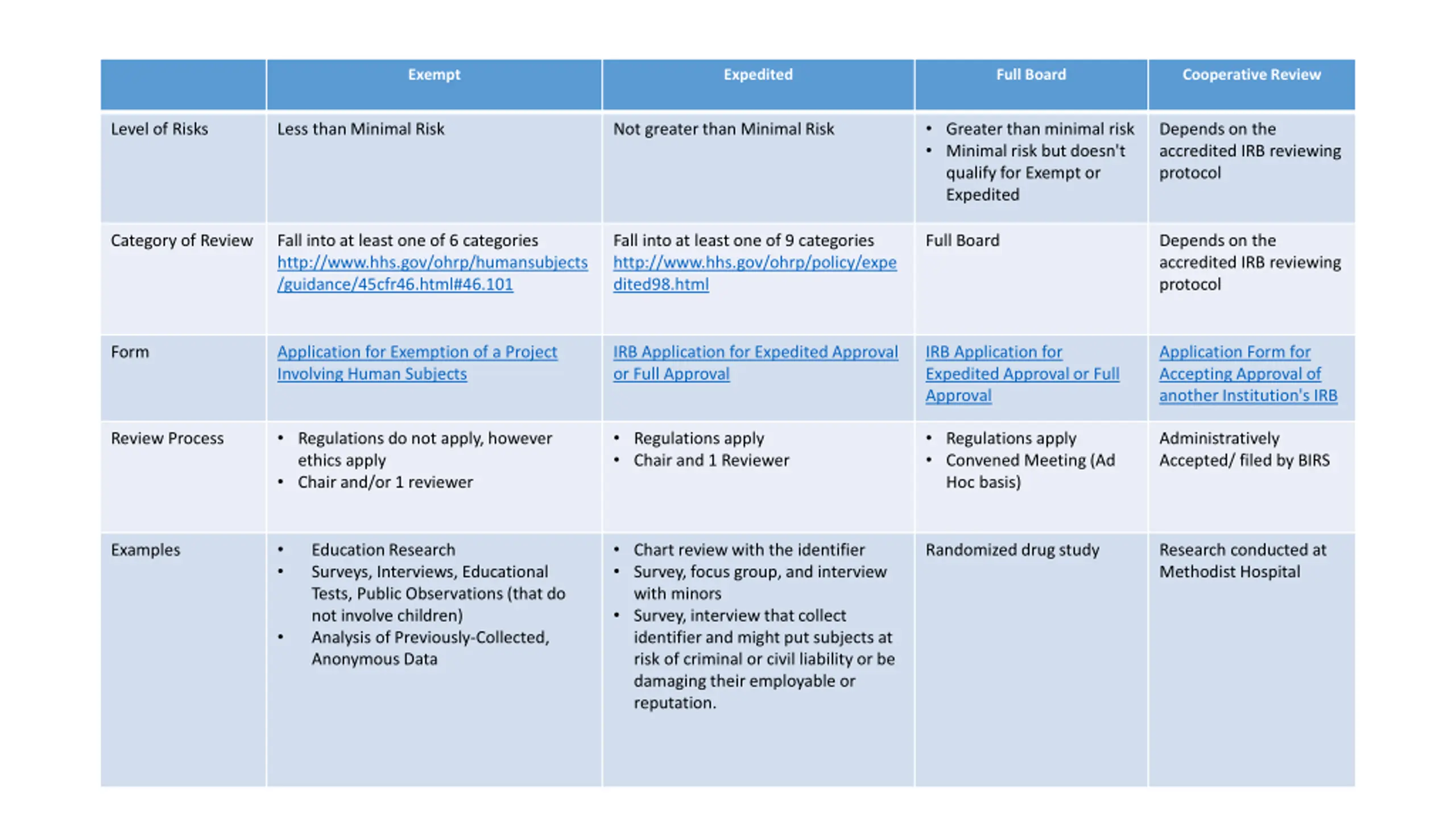 Exempt Expedited Full Board Cooperative Review Greater than minimal risk Minimal risk but doesn't qualify for Exempt or Expedited Level of Risks Less than Minimal Risk Not greater than Minimal Risk Depends on the accredited IRB reviewing protocol Category of Review Fall into at least one of 6 categories http://www.hhs.gov/ohrp/humansubjects /guidance/45cfr46.html#46.101 Fall into at least one of 9 categories http://www.hhs.gov/ohrp/policy/expe dited98.html Full Board Depends on the accredited IRB reviewing protocol Form Application for Exemption of a Project Involving Human Subjects IRB Application for Expedited Approval or Full Approval IRB Application for Expedited Approval or Full Approval Application Form for Accepting Approval of another Institution's IRB Regulations do not apply, however ethics apply Chair and/or 1 reviewer Regulations apply Chair and 1 Reviewer Regulations apply Convened Meeting (Ad Hoc basis) Review Process Administratively Accepted/ filed by BIRS Chart review with the identifier Survey, focus group, and interview with minors Survey, interview that collect identifier and might put subjects at risk of criminal or civil liability or be damaging their employable or reputation. Examples Education Research Surveys, Interviews, Educational Tests, Public Observations (that do not involve children) Analysis of Previously-Collected, Anonymous Data Randomized drug study Research conducted at Methodist Hospital