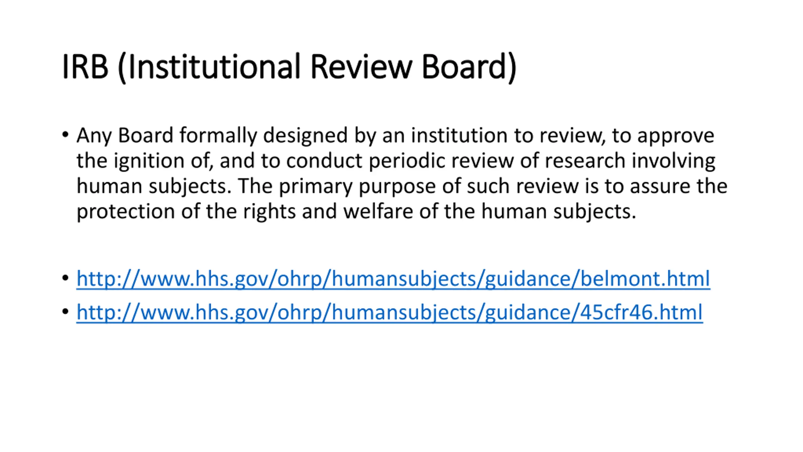 IRB (Institutional Review Board) IRB (Institutional Review Board) Any Board formally designed by an institution to review, to approve the ignition of, and to conduct periodic review of research involving human subjects. The primary purpose of such review is to assure the protection of the rights and welfare of the human subjects. http://www.hhs.gov/ohrp/humansubjects/guidance/belmont.html http://www.hhs.gov/ohrp/humansubjects/guidance/45cfr46.html