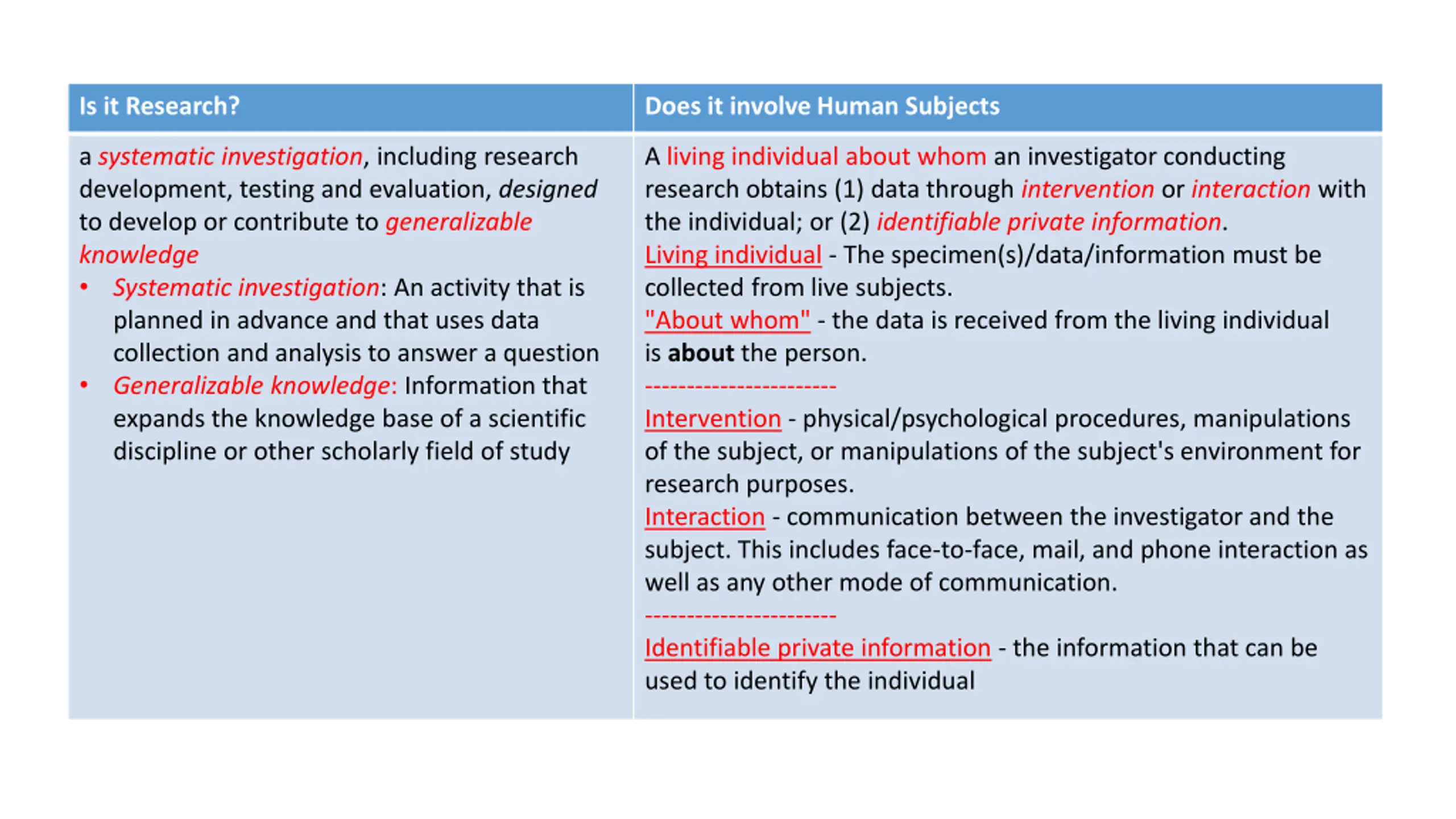 Is it Research? Does it involve Human Subjects a systematic investigation, including research development, testing and evaluation, designed to develop or contribute to generalizable knowledge Systematic investigation: An activity that is planned in advance and that uses data collection and analysis to answer a question Generalizable knowledge: Information that expands the knowledge base of a scientific discipline or other scholarly field of study A living individual about whom an investigator conducting research obtains (1) data through intervention or interaction with the individual; or (2) identifiable private information. Living individual - The specimen(s)/data/information must be collected from live subjects. "About whom" - the data is received from the living individual is about the person. ----------------------- Intervention - physical/psychological procedures, manipulations of the subject, or manipulations of the subject's environment for research purposes. Interaction - communication between the investigator and the subject. This includes face-to-face, mail, and phone interaction as well as any other mode of communication. ----------------------- Identifiable private information - the information that can be used to identify the individual