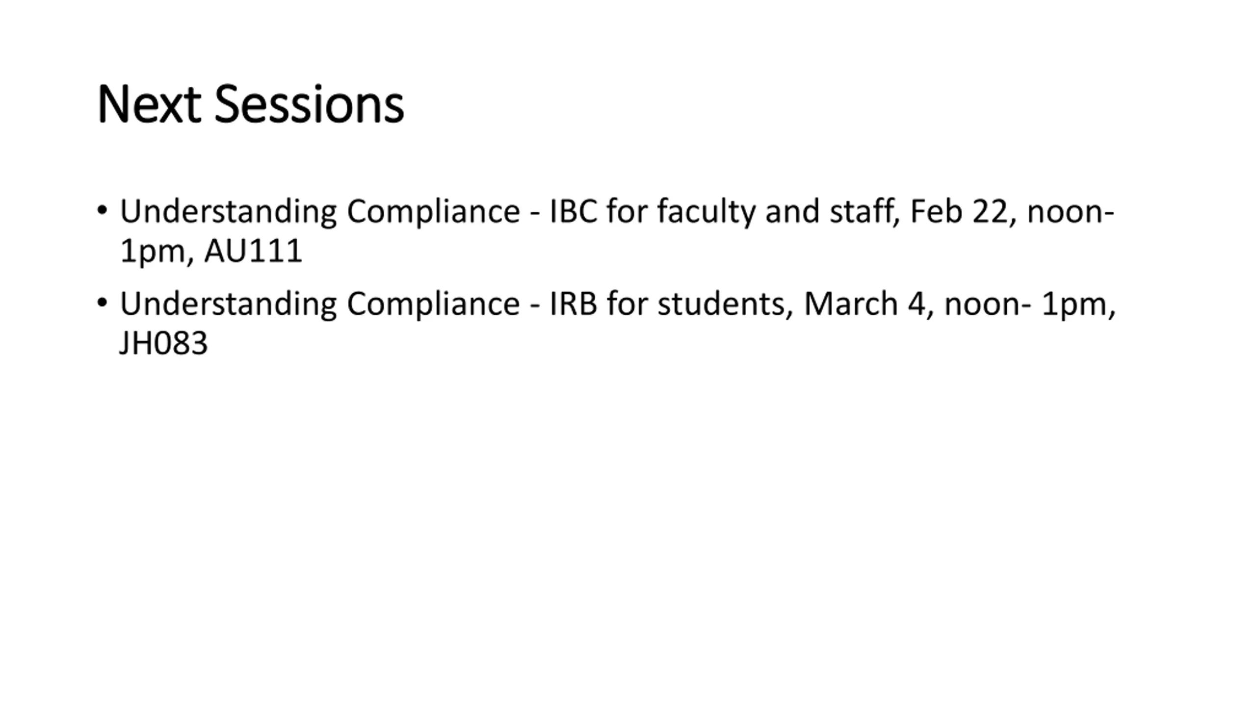 Next Sessions Next Sessions Understanding Compliance - IBC for faculty and staff, Feb 22, noon- 1pm, AU111 Understanding Compliance - IRB for students, March 4, noon- 1pm, JH083