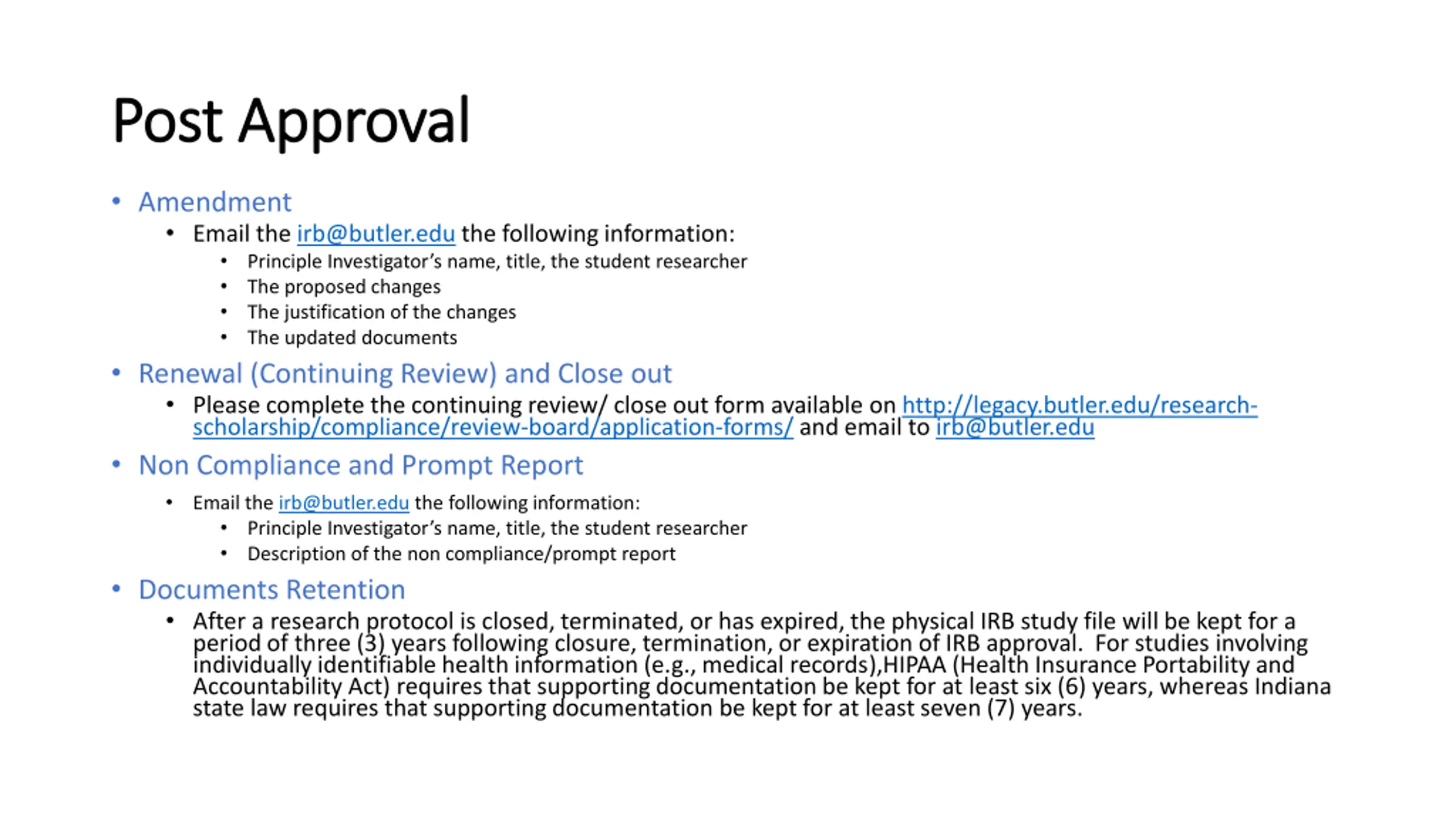 Post Approval Post Approval Amendment Email the irb@butler.edu the following information: Principle Investigator s name, title, the student researcher The proposed changes The justification of the changes The updated documents Renewal (Continuing Review) and Close out Please complete the continuing review/ close out form available on http://legacy.butler.edu/research- scholarship/compliance/review-board/application-forms/ and email to irb@butler.edu Non Compliance and Prompt Report Email the irb@butler.edu the following information: Principle Investigator s name, title, the student researcher Description of the non compliance/prompt report Documents Retention After a research protocol is closed, terminated, or has expired, the physical IRB study file will be kept for a period of three (3) years following closure, termination, or expiration of IRB approval. For studies involving individually identifiable health information (e.g., medical records),HIPAA (Health Insurance Portability and Accountability Act) requires that supporting documentation be kept for at least six (6) years, whereas Indiana state law requires that supporting documentation be kept for at least seven (7) years.
