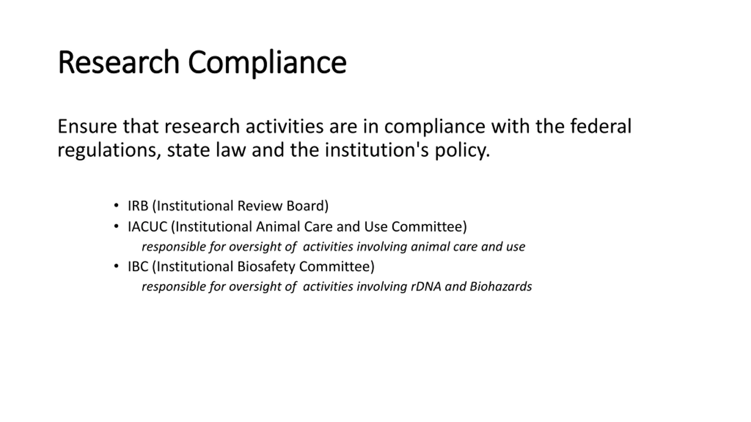 Research Compliance Research Compliance Ensure that research activities are in compliance with the federal regulations, state law and the institution's policy. IRB (Institutional Review Board) IACUC (Institutional Animal Care and Use Committee) responsible for oversight of activities involving animal care and use IBC (Institutional Biosafety Committee) responsible for oversight of activities involving rDNA and Biohazards