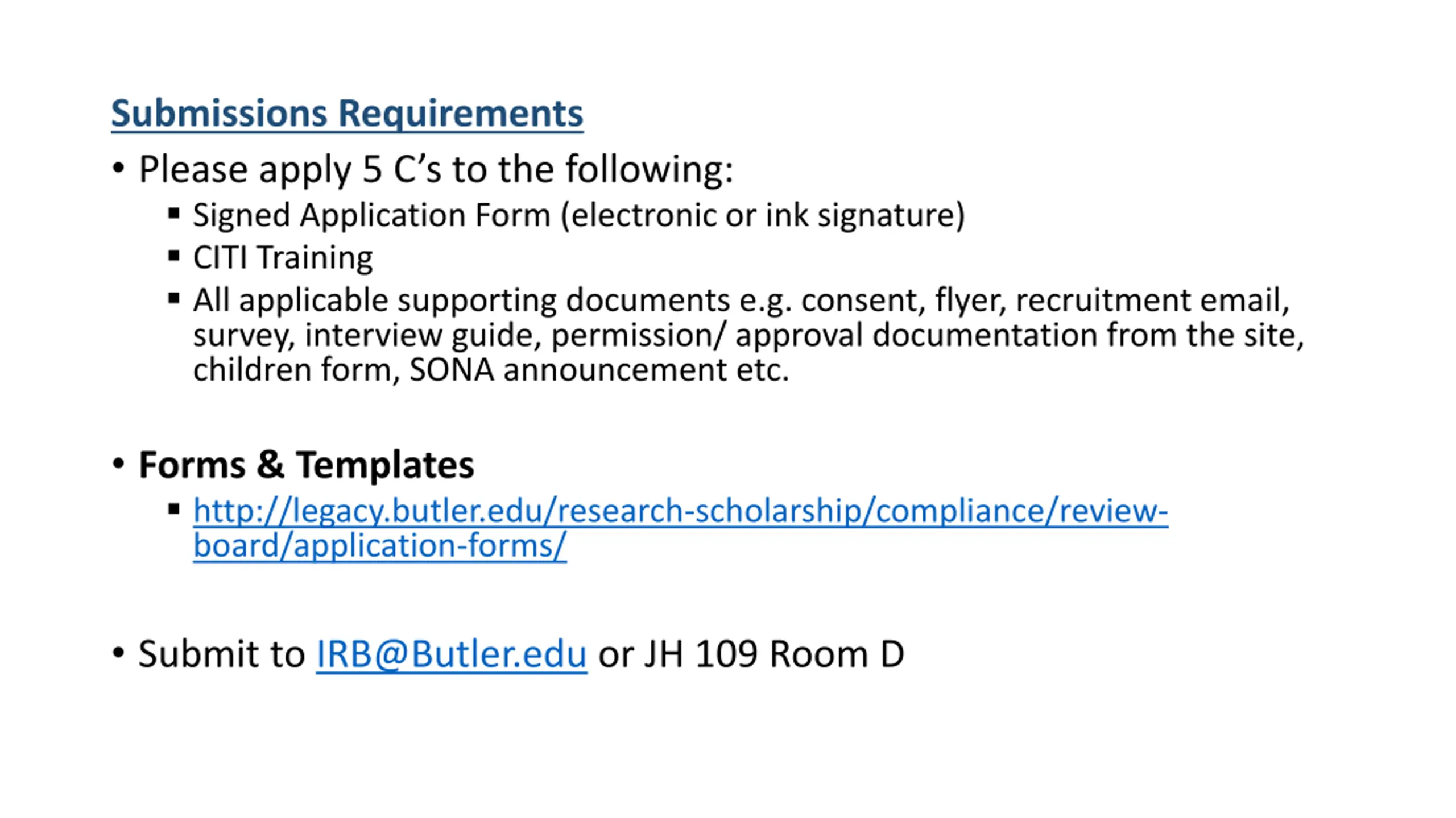 Submissions Requirements Please apply 5 C s to the following: Signed Application Form (electronic or ink signature) CITI Training All applicable supporting documents e.g. consent, flyer, recruitment email, survey, interview guide, permission/ approval documentation from the site, children form, SONA announcement etc. Forms & Templates http://legacy.butler.edu/research-scholarship/compliance/review- board/application-forms/ Submit to IRB@Butler.edu or JH 109 Room D